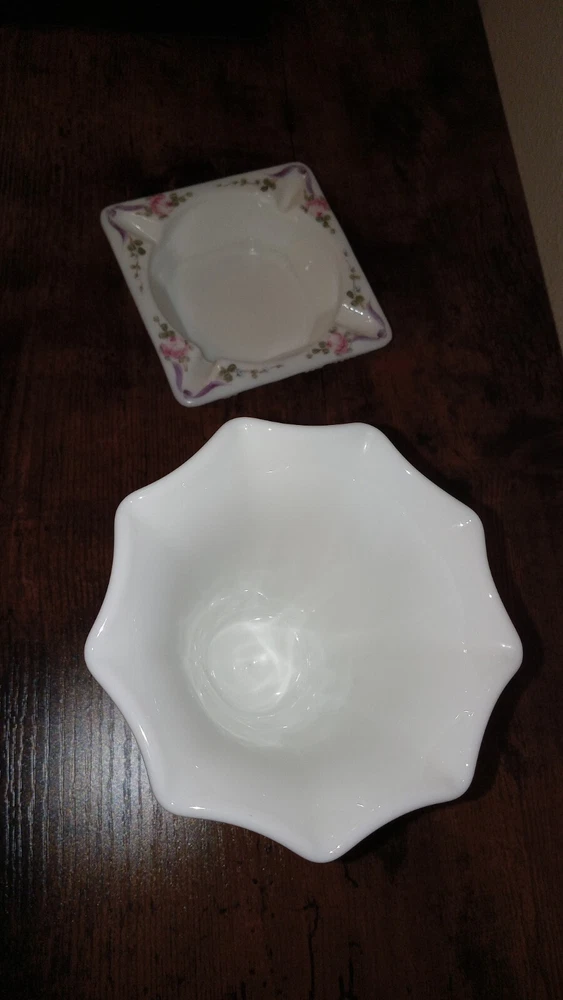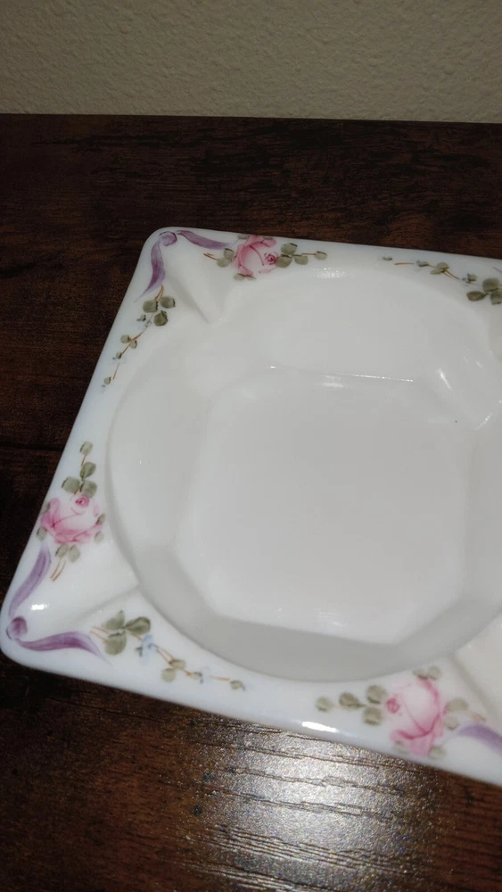 WESTMORLAND MILK GLASS GRAPES WITH HAND-PAINTED RIBBON & ROSES VASE and ASHTRAY. Beautiful set Vase is mint no cracks or chips Ashtray has two blemish chips that are almost not visible (see pics)...