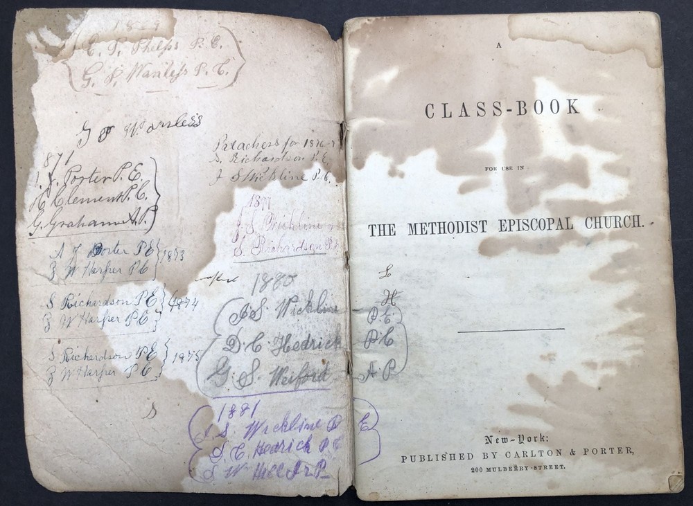 1869-1877 Class Book of Greenbrier Methodist Episcopal Church Author: Greenbrier County, WV Title: 1869-1877 Class Book of Greenbrier Methodist Episcopal Church Publication: Greenbrier County, WV: 1869-1877 Description: 7.5 x 5 inches, limp leather, fair to good condition, stains and wear to covers, contents good or better. With roll of names and in some cases dues collected, for parish members in Greenbrier, WV. Dates haphazardly assigned, but appears to be a record of attendance from 1869-1877. Not sure what town this church was in, but from the title on the cover it was in Greenbrier County in southern WV, and we imagine Lewisburg would be where the church was. Approximately 25 pages with writing on them. Fair. Seller ID: H33743 Subject: West Virginia RAREBOOKSTORE RareBookStore is a long-established eBay seller specializing in used and rare books in all fields-plus prints, ephemera, maps, music, photography, and the occasional painting. We sell good books at good prices and want you to be satisfied with your purchase. Be sure to add us to your "favorite" sellers and check back to see new items listed daily! We pride ourselves on our high standards, high eBay ratings, and helpful staff, so please contact us directly if you encounter any issues. Standard shipping is via USPS Media Mail. Expedited options are available at checkout. Payment is expected within 2 business days unless otherwise arranged. Our warehouse is staffed Monday-Friday and we respond to inquiries as quickly as possible. We hope you enjoy browsing our selection of great books. Happy reading! This listing was created by Bibliopolis.