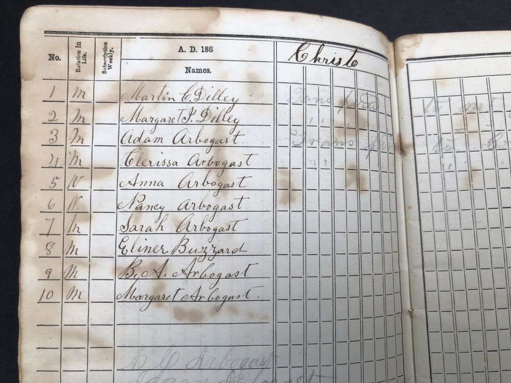 This historical church record offers a fascinating glimpse into post-Civil War West Virginia life through its detailed member attendance and dues records. The well-preserved contents make it a treasure for genealogy researchers despite some cover wear.