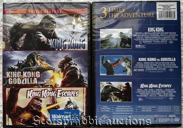 Walmart Exclusive 3 KING KONG MOVIES Factory Sealed DVD Godzilla Escapes X Click to Enlarge FACTORY SEALED DVD - WALMART EXCLUSIVE 3 Movies on 1 DVD Triple Feature - Universal KING KONG KING KONG VS GODZILLA KING KONG ESCAPES Please see photo's (SHOWS THE FRONT AND BACK) ONLY 1 INCLUDED From a smoke free environment PLEASE NOTE: I DO NOT ACCEPT RETURNS!!!!! I DO NOT ACCEPT RETURNS FOR ITEMS THAT ARE BRAND NEW AND SEALED!!!!! PLEASE DO NOT REQUEST TO RETURN AN ITEM - AS I'M STATING THERE ARE NOT RETURNS. I am very careful is listing the condition of the item. If it is sealed, then it is new and I have purchased at a store. If I neglect to state the condition, then I will take the return. NO INTERNATIONAL SHIPPING AT THIS TIME Buyer please pay within 7 days. NOTE: If you are bidding in other auctions, please wait until all auctions are over and then I can send you a combined invoice - just let me know when you are ready for your invoice. If I ship to anywhere in Florida, I need to collect 6.5% sales tax - I report it quarterly to IRS in Tallahassee. Recently someone was upset about the tax issue, but I have a tax certificate and am honest to report whatever I sell and ship in the State of Florida. I SHIP ONLY to PAYPAL VERIFIED ADDRESSES - NO exceptions - if you want to use PayPal, you can go onto their site and add a different confirmed address. It's very easy to do - thanks I am a single seller, not a huge store, so I do not generally accept returns. If I make a mistake, then I'm glad to make up for it - but I cannot accept things if you don't want the item - or if it will not fit on something (such a camera, etc.) - Please make sure you want the item before you bid. Thanks. I try and ship out within 2 business days; sometimes if I get payment early enough in day, I can ship same day. My goal is to get your item to you as soon as possible. See my other listings for more great items! Please pay within 3 days after close of auction. PLEASE NOTE: If you are bidding in multiple transactions, please let me know – and then at the END of bidding, I can send you a combined shipping invoice. I'm glad to combine auctions - please wait until all auctions are over so that I can send combined shipping invoice txzj pxzj24187 txzj-11 txzj85 txzj115