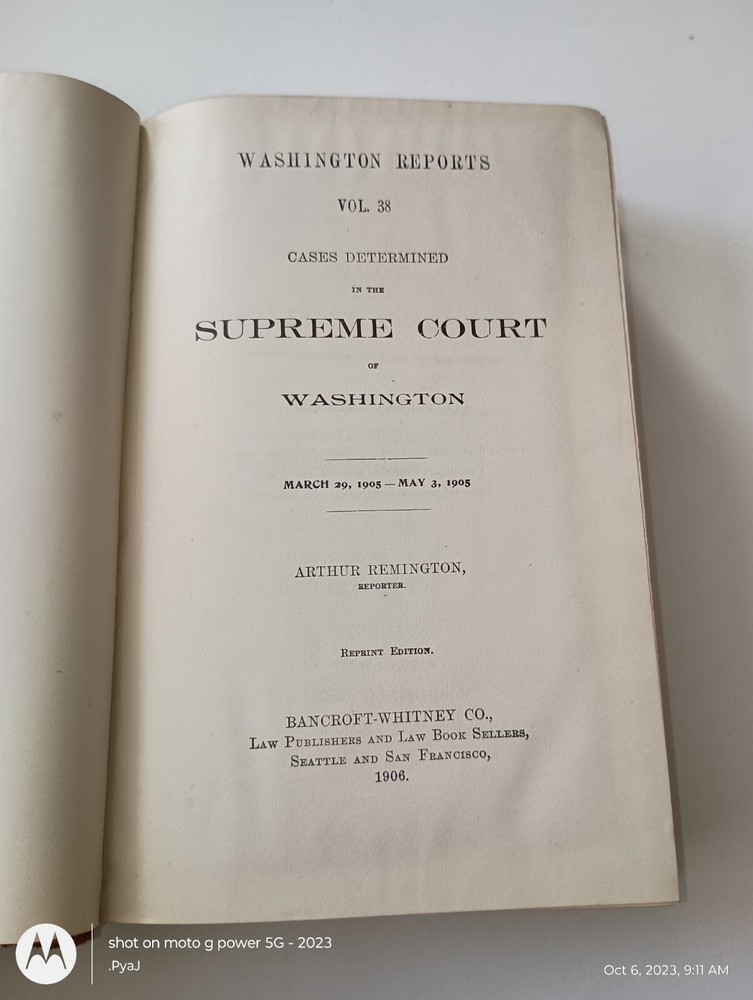 This antique book, titled Washington Reports Volume 38 Remington 1905, is a great addition to any collector's library. With leather binding and printed in the United States, this book contains historical information about the Supreme Court of Washington. It is a valuable resource for those interested in the subject of law and history. The year printed is 1905, making it a unique piece of history to own.