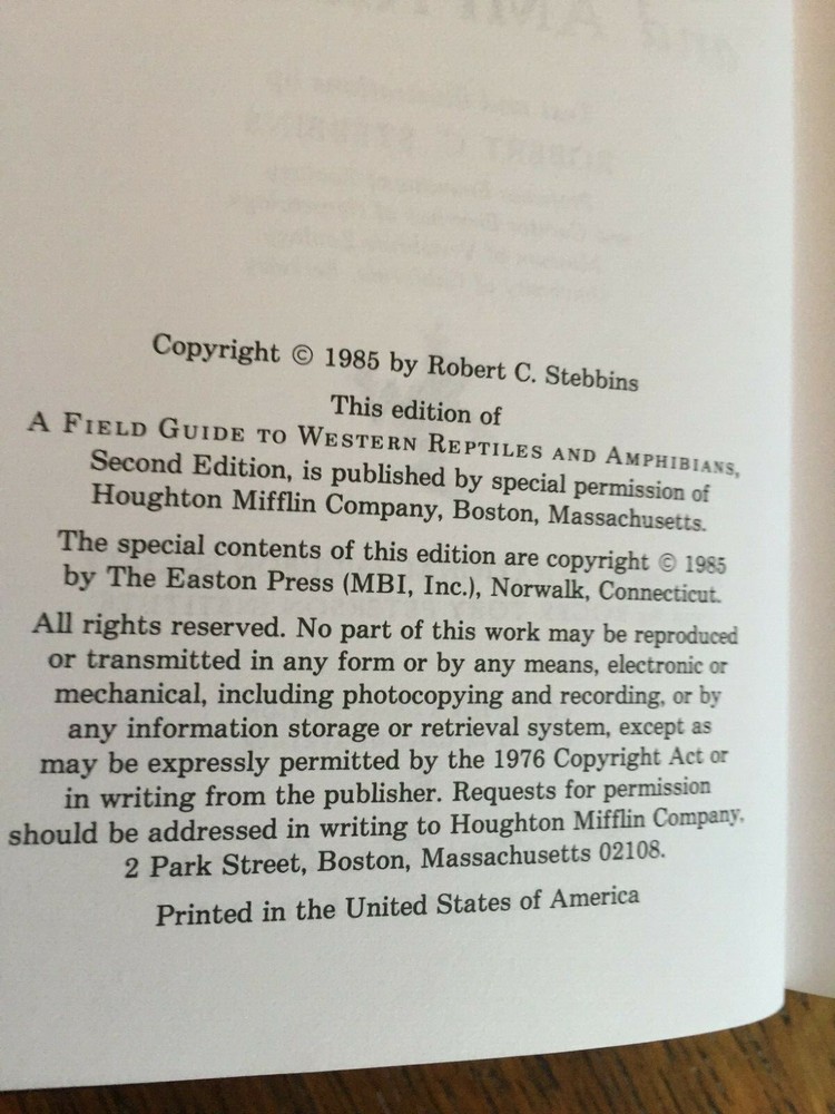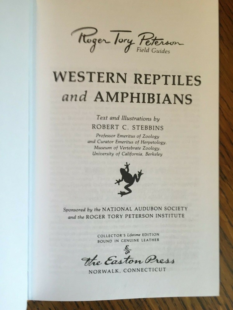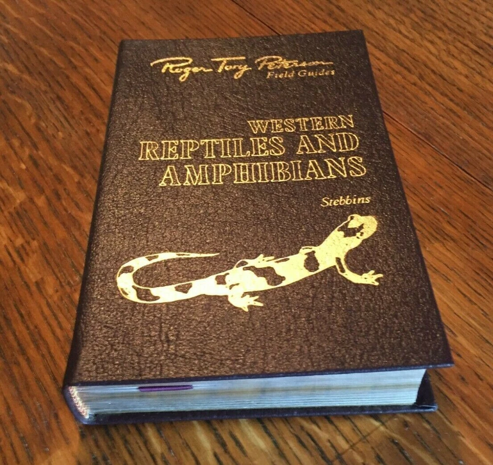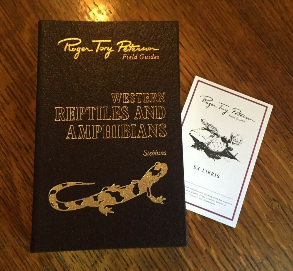 Western Reptiles and Amphibians Peterson Field Guide Easton Press 1985 Leather. Guilded pages, Silk Ribbon. Collector's Edition. Limited Edition. Like New Condition. Smoke free home. Selling for a local Senior Center as a Volunteer. I have 2 other Leather Collector's Edition Peterson Guides in my Listings. Thank you for looking.