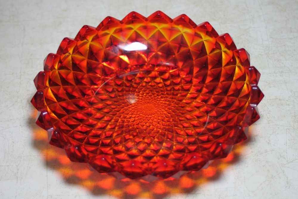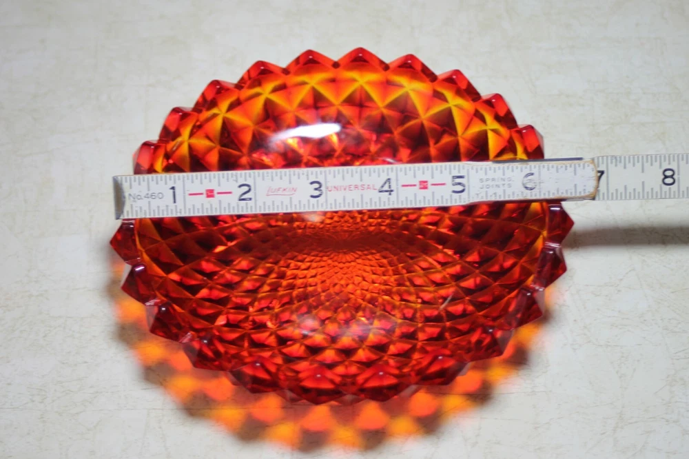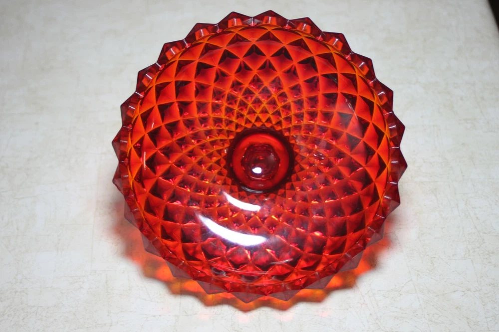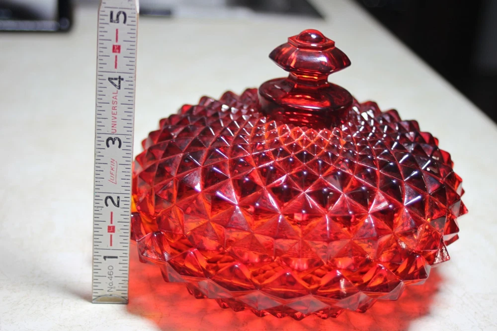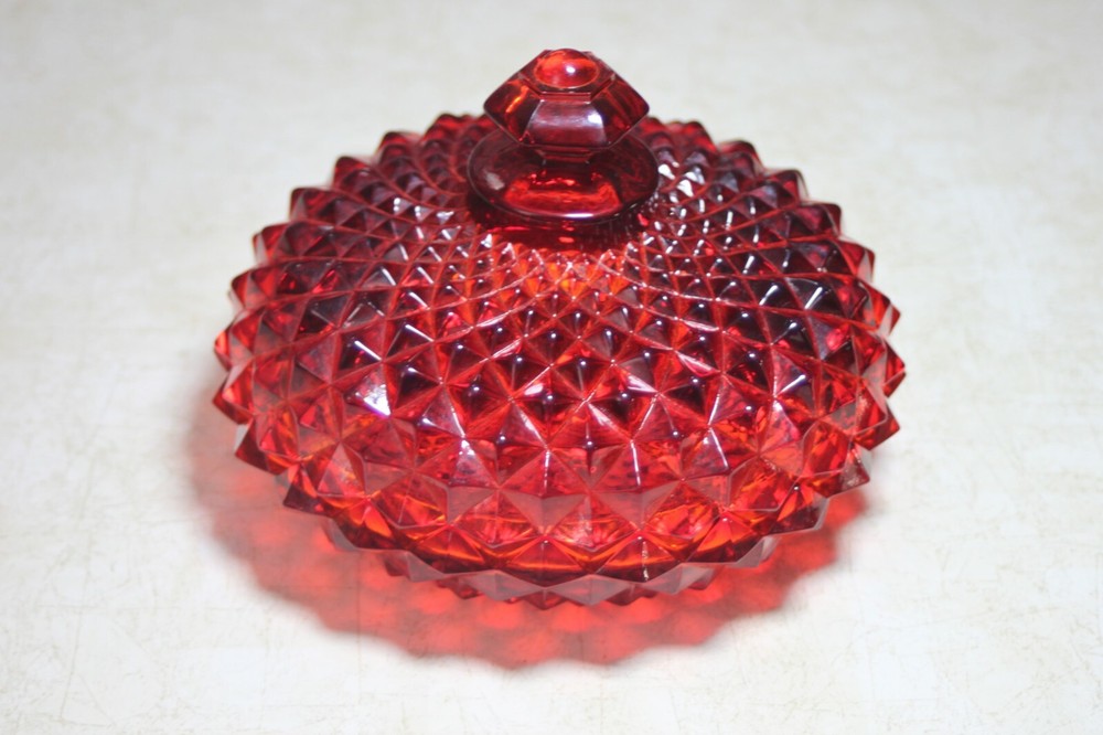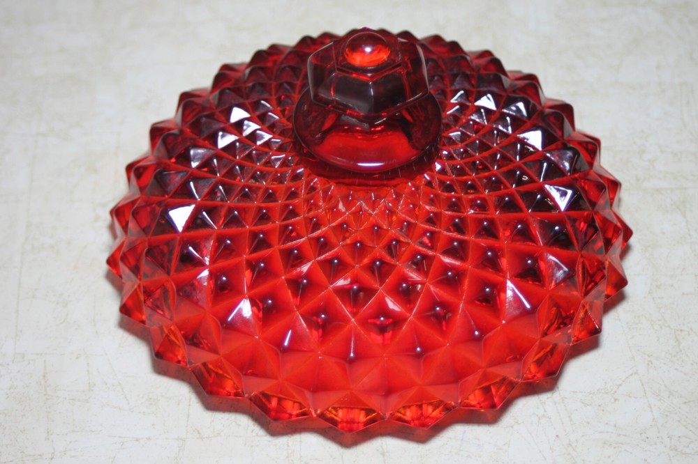 This is a Westmoreland Glass English Hobnail pattern covered candy dish. The glass is red, with a little tint of orange. Not 100% sure if this is a candy dish or a lidded ashtray, I would lean towards candy type dish. The piece is about 6.5" in diameter and stands about 4.5" tall to the top of the handle. Nice condition, no chips or cracks. Both bottom and type piece have the WG makers mark.