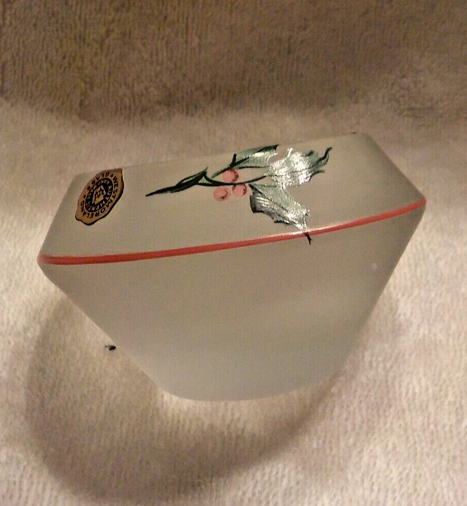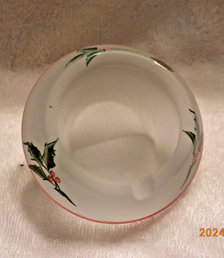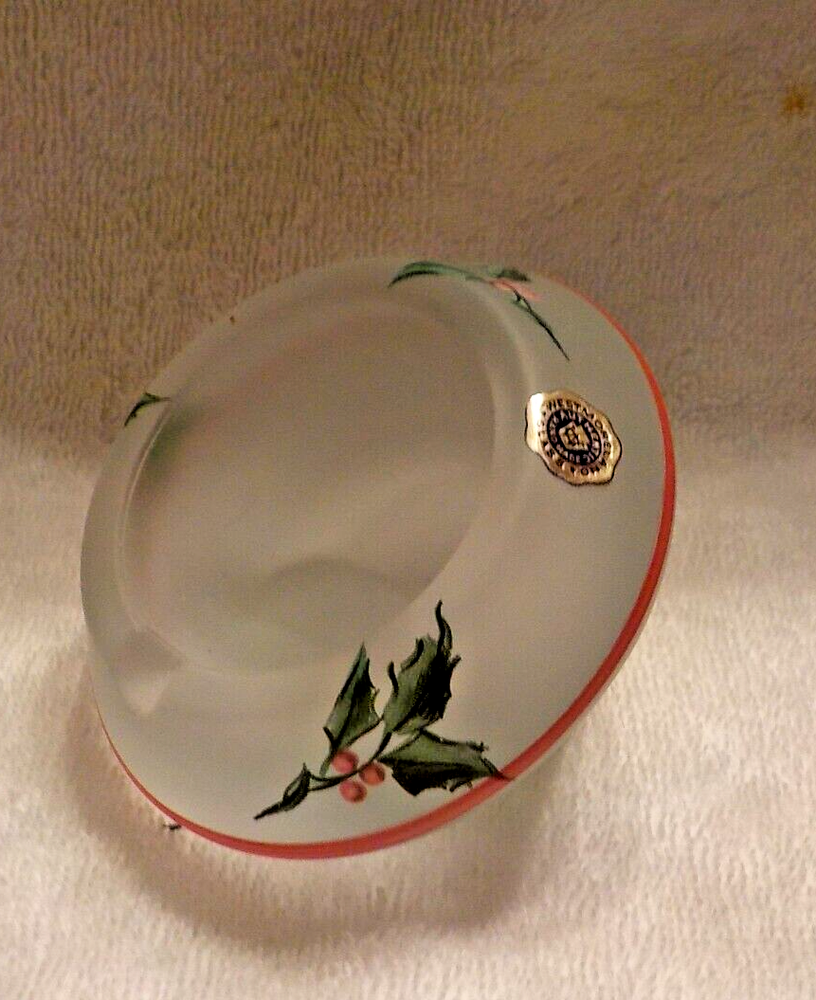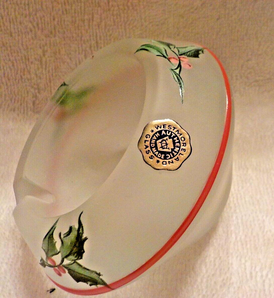 Westmoreland Glass crystal mist ashtray with holly 4" x 2.5" hand painted with Holly has Westmoreland Glass sticker slot for cigarette, slanted bottom like new condition - no chips, cracks or blemishes I appreciate feedback and strive for a 5 star performance. If you have any concerns about your item please let me know before leaving Negative or Neutral feedback. I am always happy to combine shipping. Smoke free home. International shipping is additional. Thanks so much for your business
