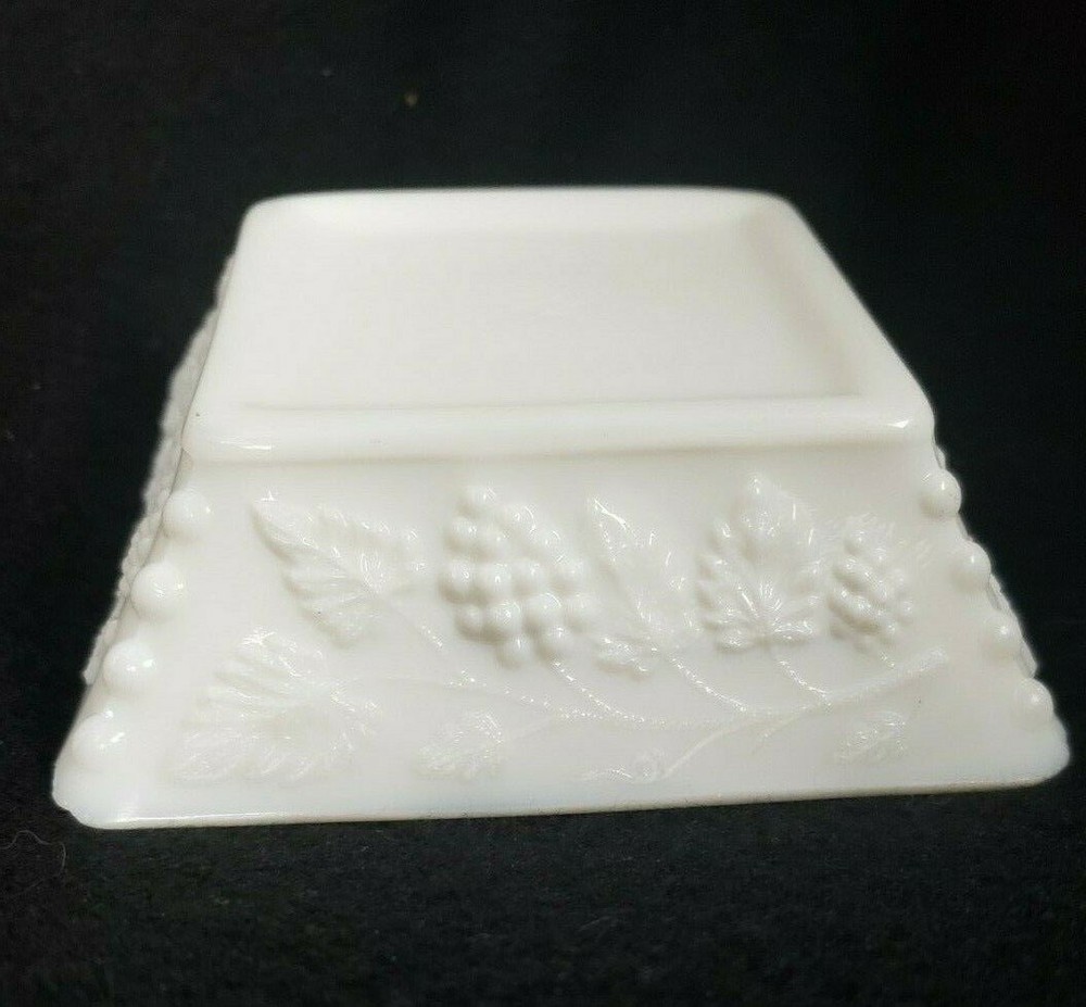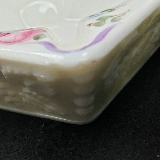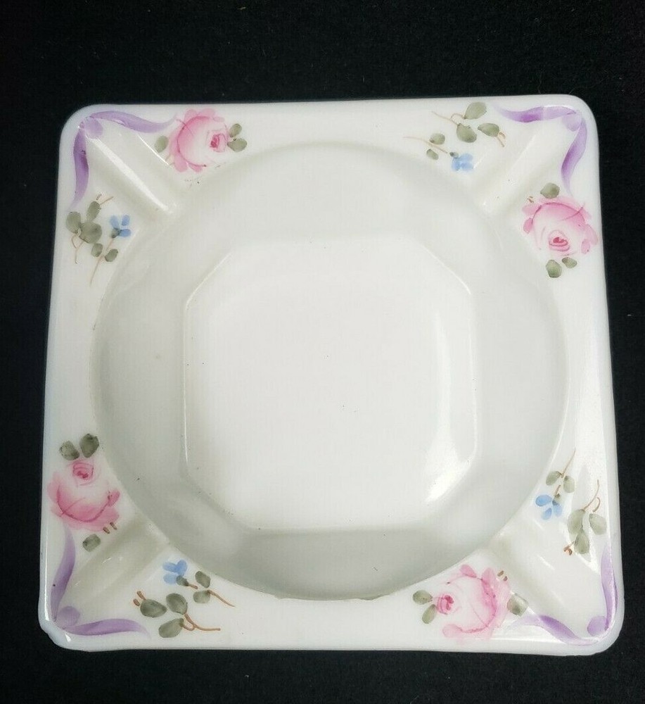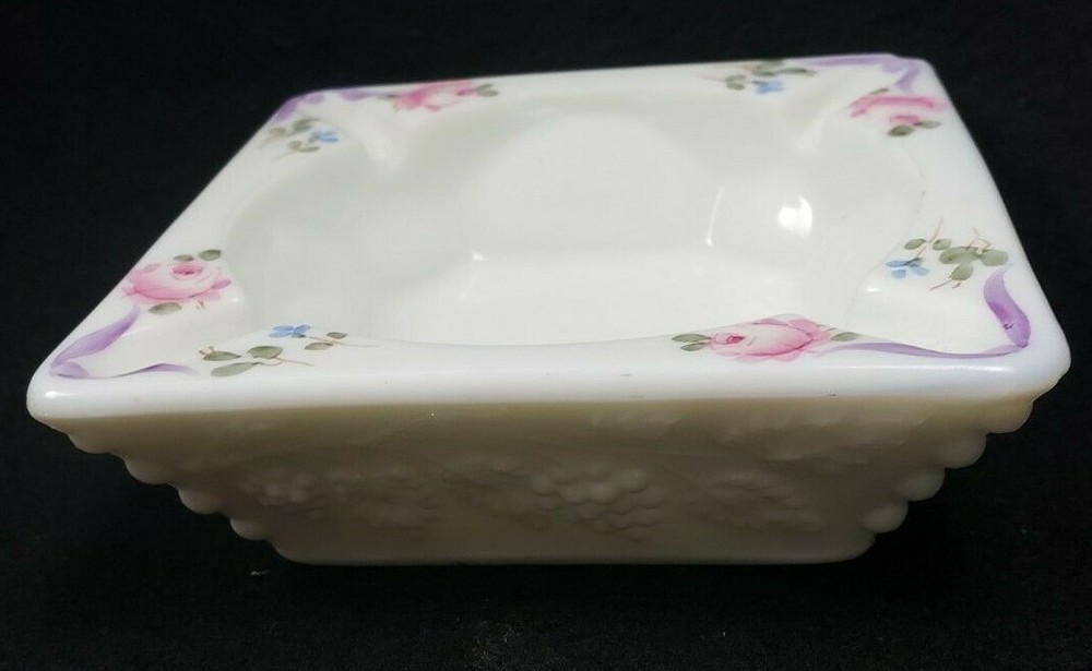 Westmoreland Hand Painted Beaded Edge Milk Glass Ashtray Roses & Bows Design. The Ashtray is a 4" square and is heavy. It is adorable. It does have a chip on one corner; however, it is not noticeable. Please see photos. Condition is Used. Shipped USPS Priority Mail. Please contact us if you have any questions, concerns, comments or need additional pictures. Feel free to make an offer on any of our treasures! Pickin' Peaches