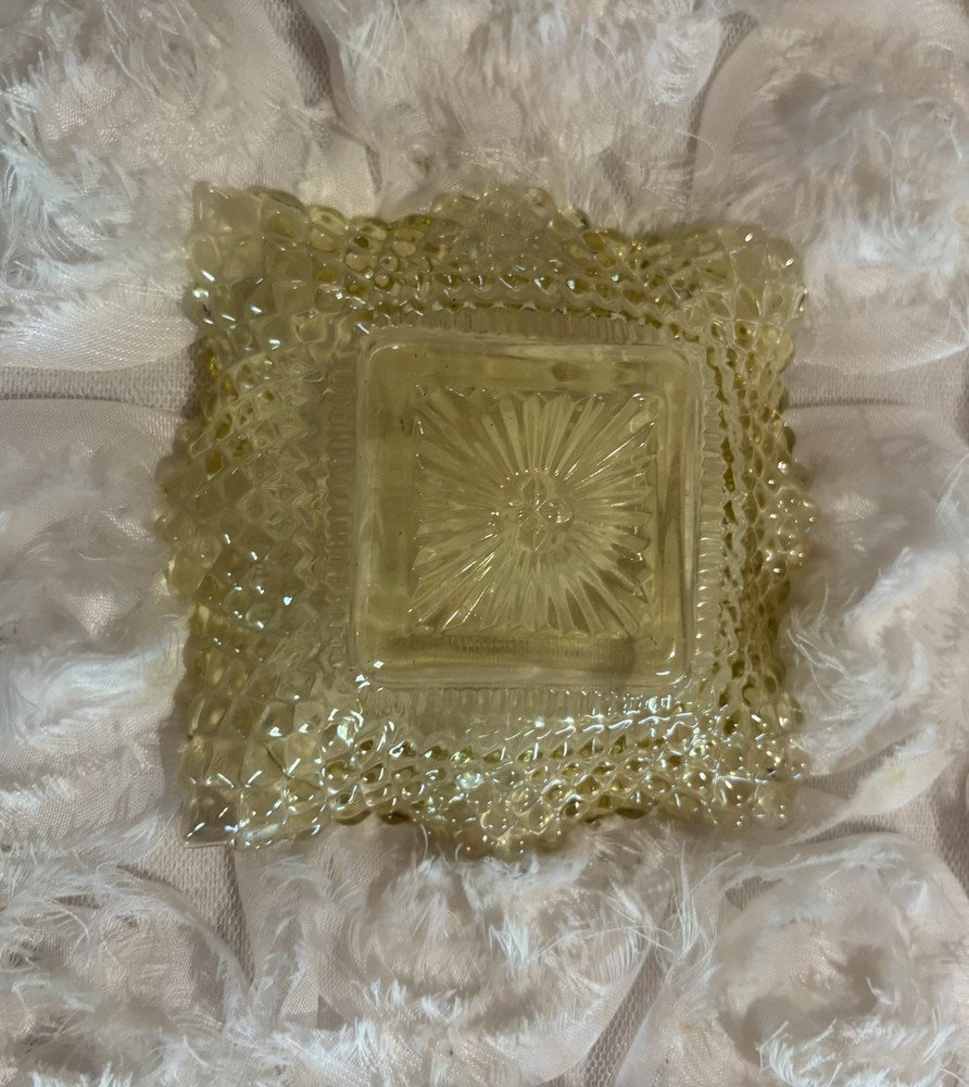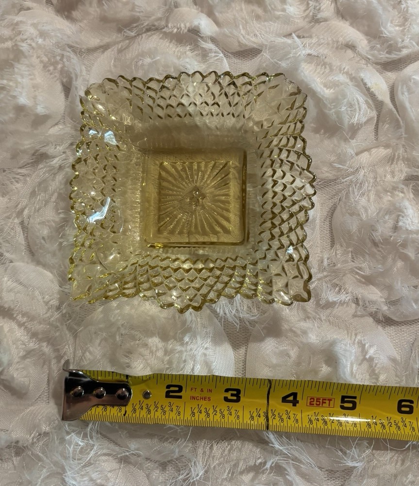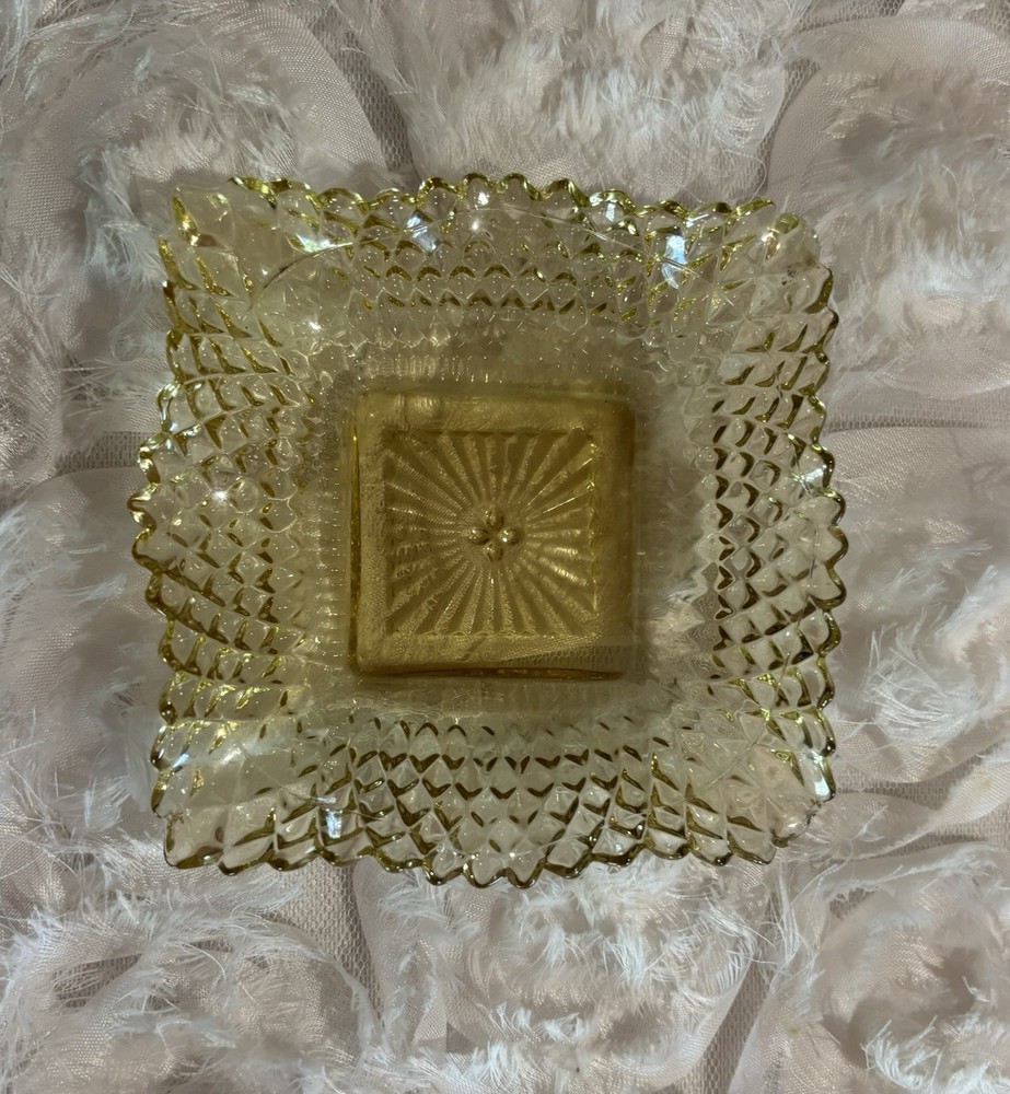 Embrace the charm of yesteryear with this Westmoreland Hobnail Glass Bowl Ashtray, a stunning example of Art Deco design. Crafted in the 1950s, this amber depression glass piece features a captivating ruffle edge and a hobnail pattern that exquisite to the touch. Perfect for use on any occasion, its square shape and glossy finish make it a versatile addition to your home decor. This original Westmoreland bowl, manufactured in the United States, is not only a practical item for your guests but also a decorative masterpiece that speaks volumes of your taste in vintage aesthetics. Hand wash care is recommended to maintain its luster and integrity. Add a touch of nostalgia to your collection with this elegant, timeless piece. Please beware one corner is slightly rough feeling in a little spot. There doesn’t seem to be a chip or anything? H1