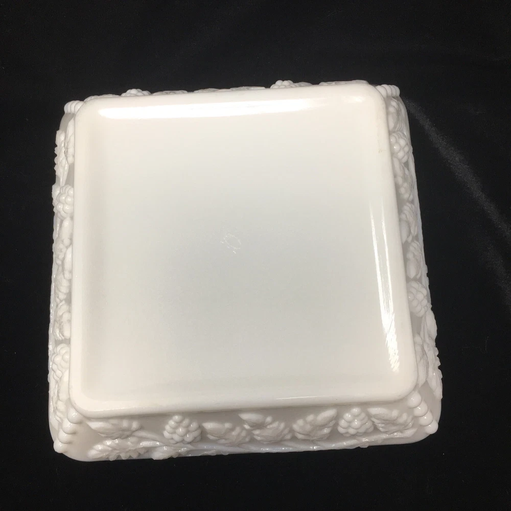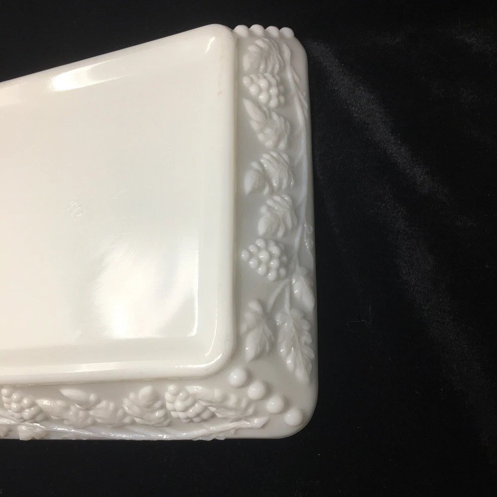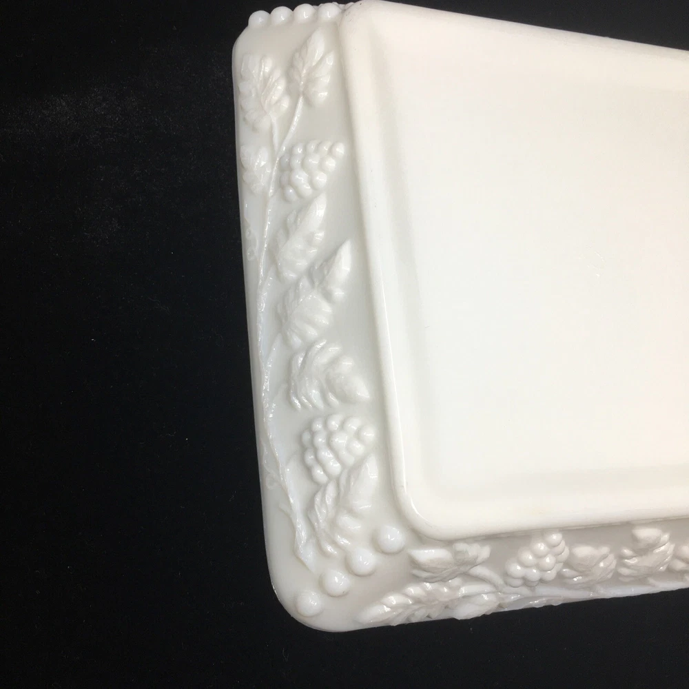 Has a chip on one of the corners right where the cigarette would sit. Westmoreland Milk Glass Cigarette/Joint Ashtray Grape Leaves 5" Vintage 1970’s.
