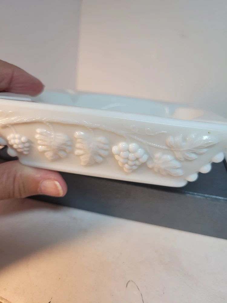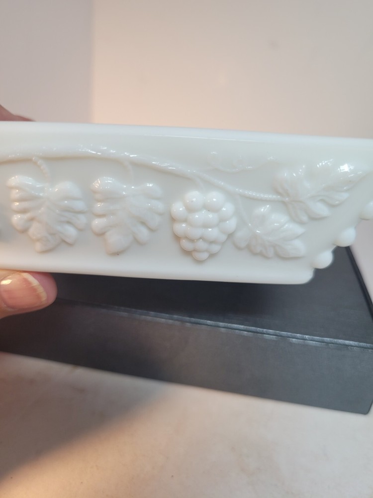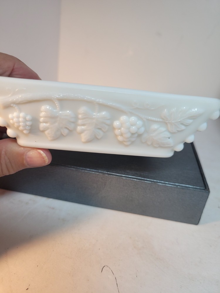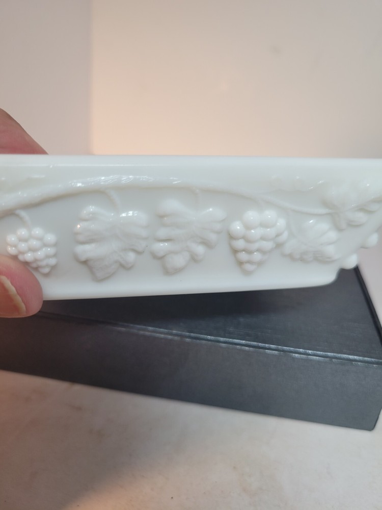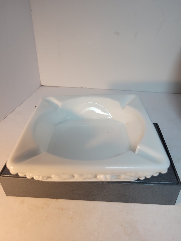 This Westmoreland milk glass ashtray is a perfect addition to your collection. Measuring 5\" in length and height, it features a square shape with a beautiful grape pattern. The glossy finish and incised backstamp add to its charm. This ashtray, suitable for cigarettes, can also be used to hold trinkets or candy. Made in the United States, this piece of decorative pottery and glassware is perfect for those who appreciate floral and garden-themed items. The material used is high-quality glass and the color is white. The production style is milk glass. This ashtray is suitable for those who prefer items with an origin in North America. Get this beautiful piece from eBay today! No chips or cracks
