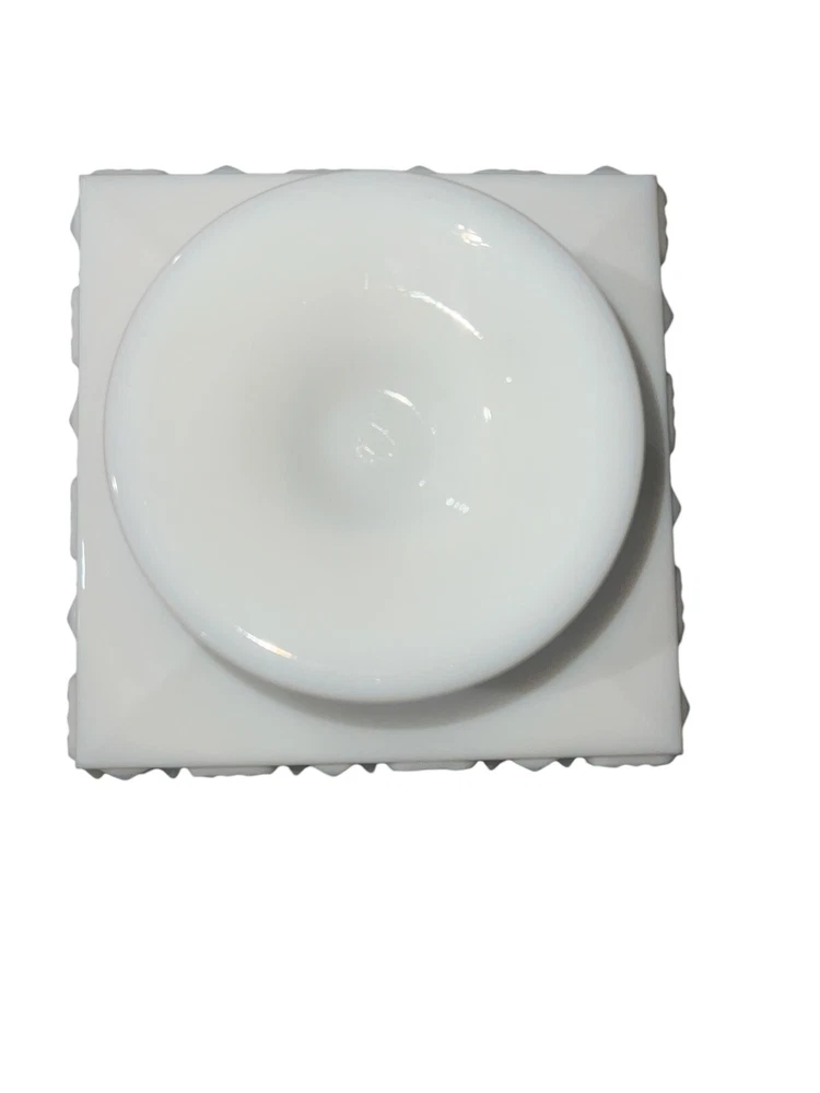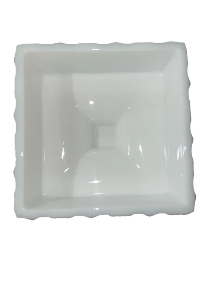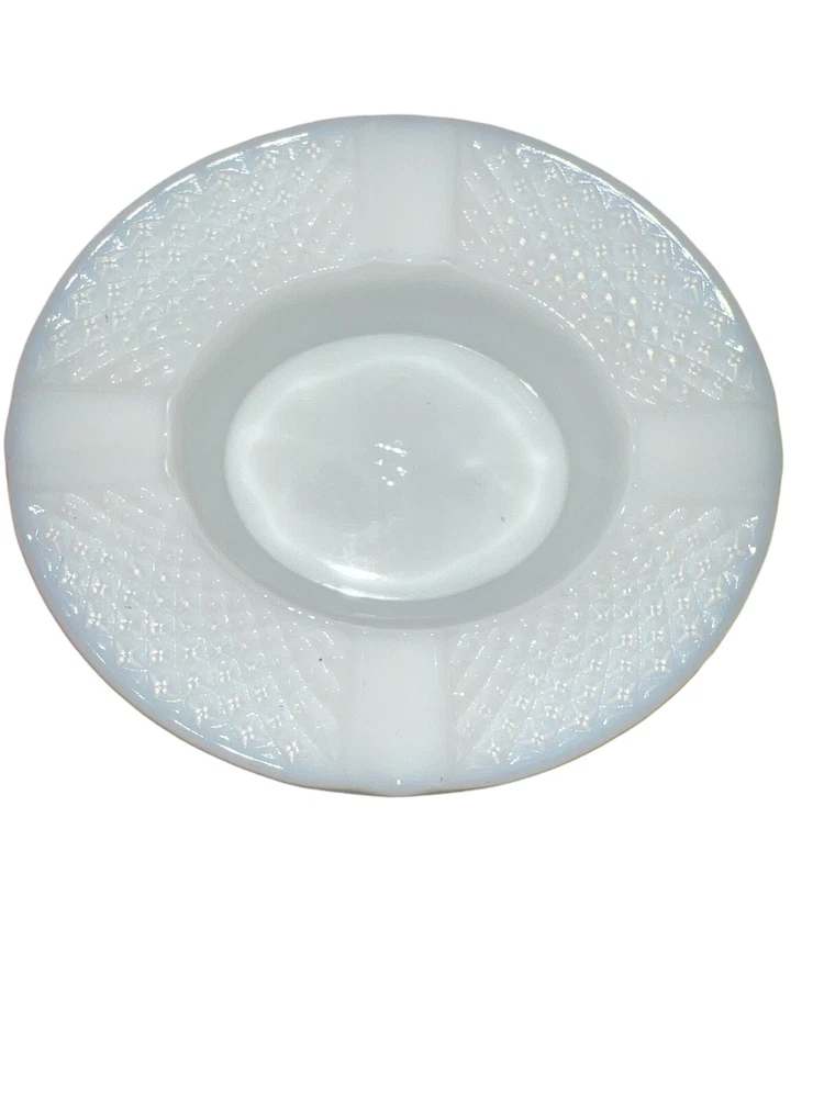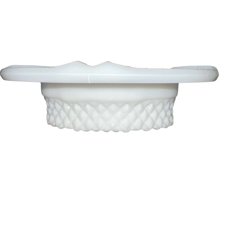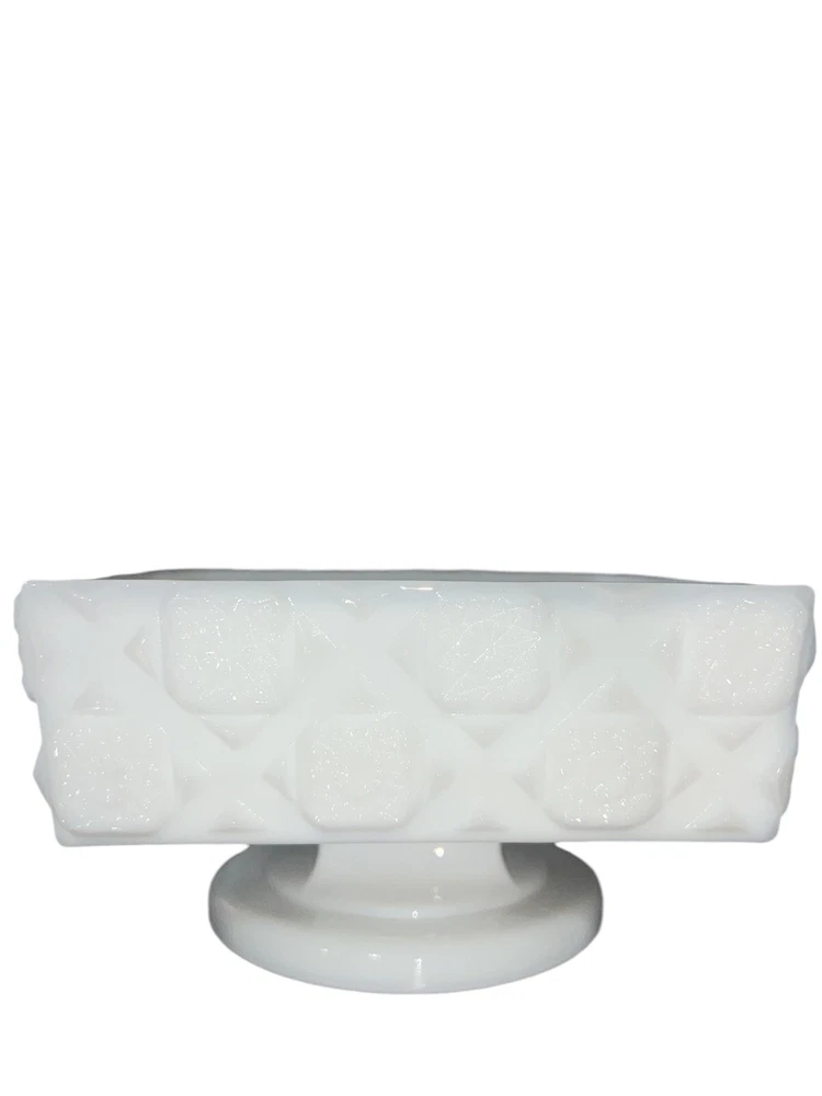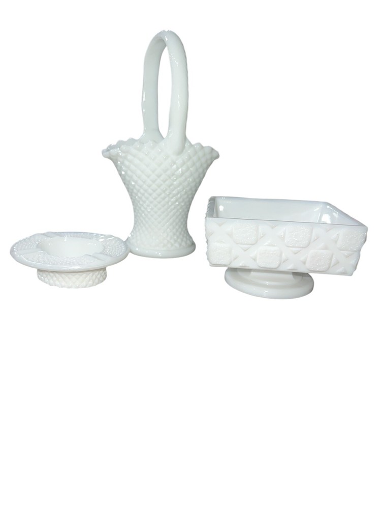 This lot of three Westmoreland Milk Glass kitchenware pieces features a square pedestal dish with The Old Quilt Pattern, an oval basket, and an ashtray with the Diamond Point Design on the white glass adds a touch of elegance to any table setting. The production style is milk glass, and the product line is Westmoreland. The dishes are perfect for serving small snacks or dips, and the ashtray is a great addition to any collection. The dimensions of the pieces are as follows: 9” Tall for the pedestal dish, 2 3/4" Tall for the oval basket, and 1 3/8" Tall for the ashtray. Items are Used and still and Great Condtion