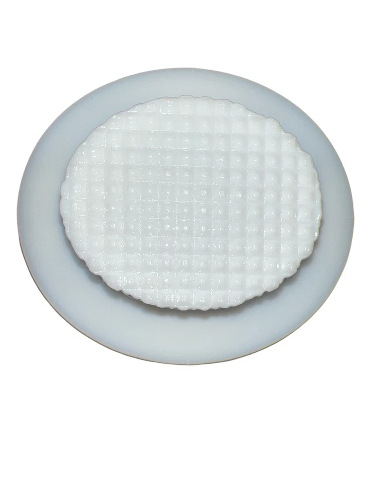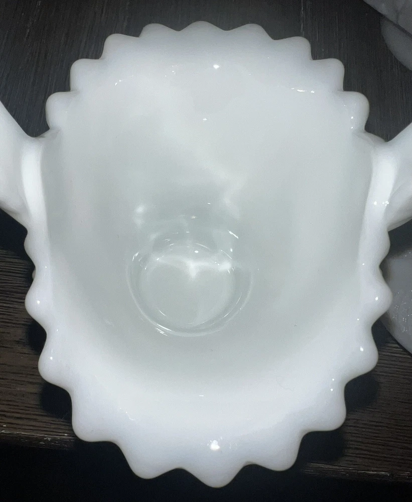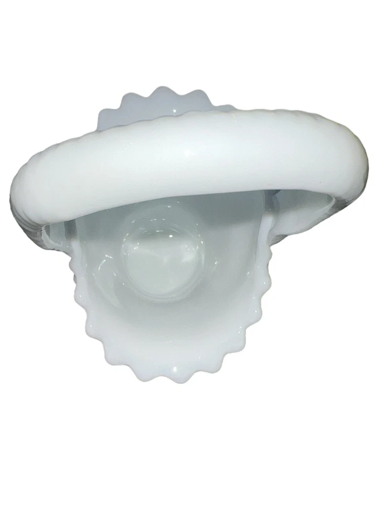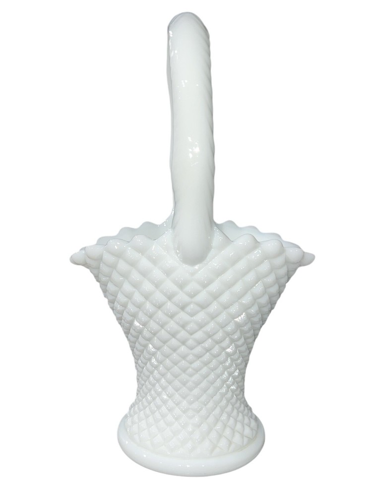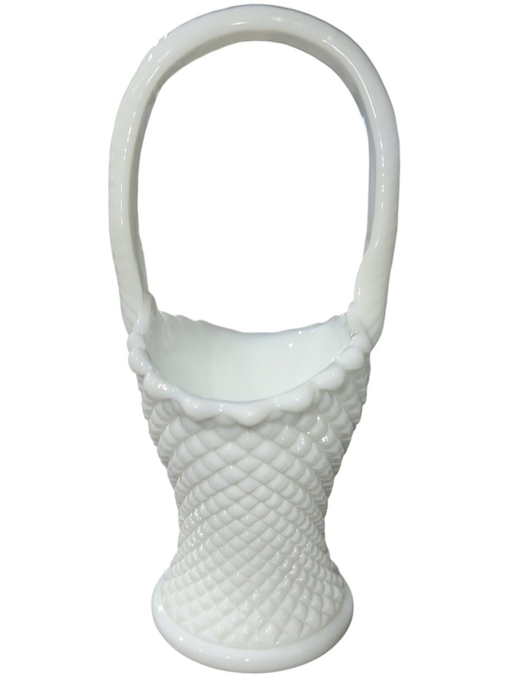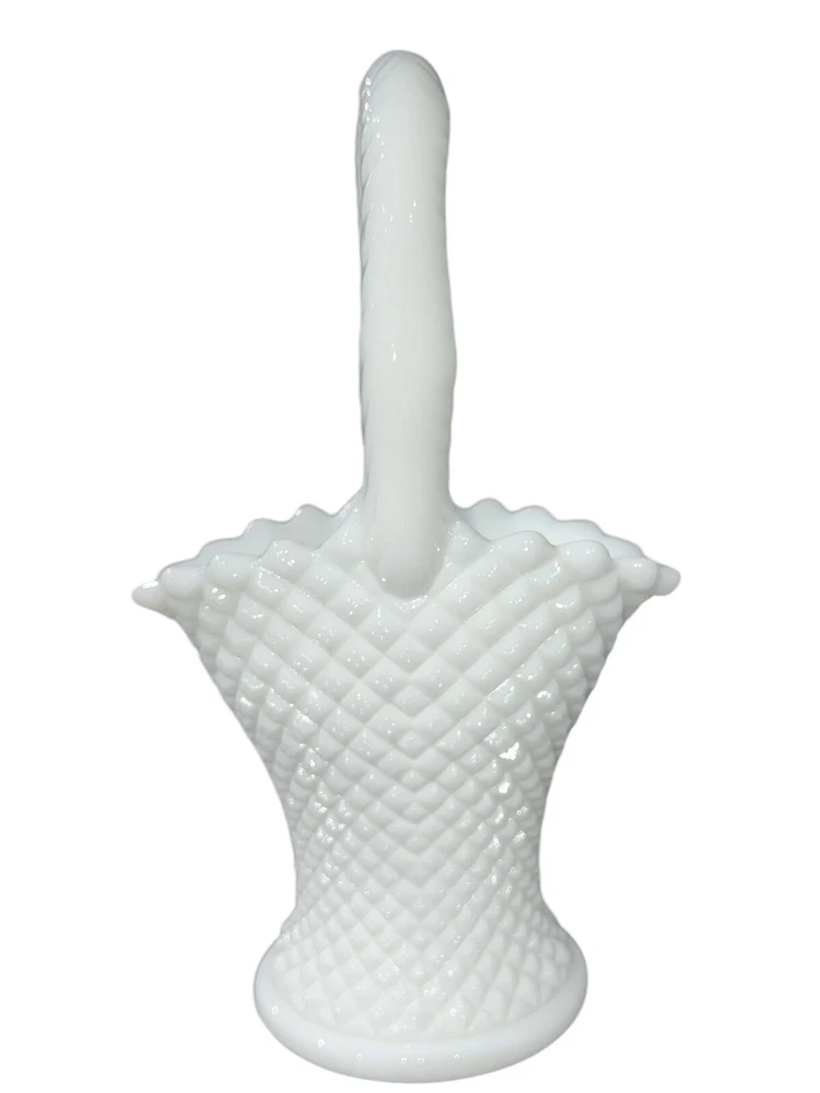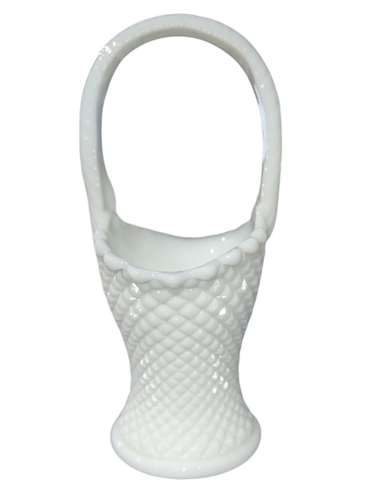 This lot of three Westmoreland Milk Glass kitchenware pieces features a square pedestal dish with The Old Quilt Pattern, an oval basket, and an ashtray with the Diamond Point Design on the white glass adds a touch of elegance to any table setting. The production style is milk glass, and the product line is Westmoreland. The dishes are perfect for serving small snacks or dips, and the ashtray is a great addition to any collection. The dimensions of the pieces are as follows: 9” Tall for the pedestal dish, 2 3/4" Tall for the oval basket, and 1 3/8" Tall for the ashtray. Items are Used and still and Great Condtion