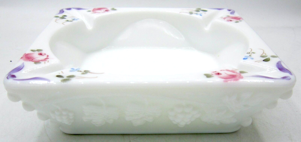 Up for sale is a milk glass square ashtray made by Westmoreland Glass. It features painted flowers around the border and a raised grape relief on the sides. The ashtray stands 1 1/2 inches tall and measures 5 inches in diameter. This vintage ashtray is in very good used condition with no chips or cracks. Please send a message with any questions you may have. Shipping costs include tracking. Thank you for browsing Never Gets Old Shop!
