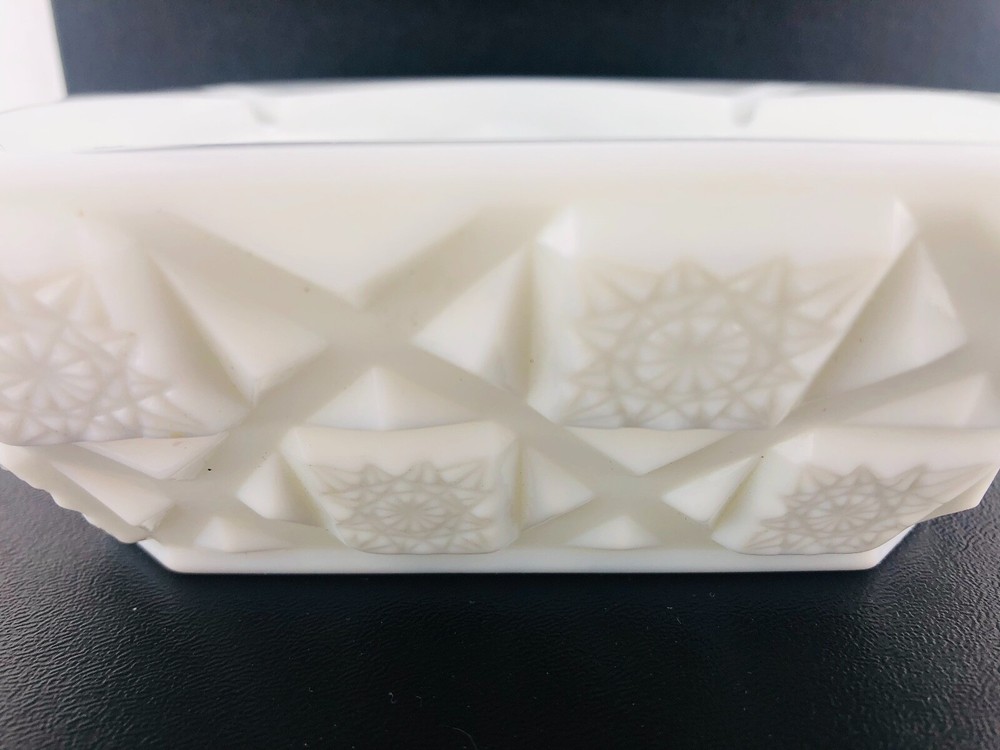 Westmoreland Old Quilt White Milk Glass Medium Ash Receiver Ashtray Square approximately 6.5". In good used vintage condition. Please see all pictures. Marked on bottom with the W G hard to picture.
