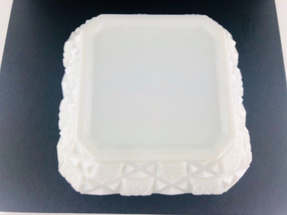 Westmoreland Old Quilt White Milk Glass Medium Ash Receiver Ashtray Square approximately 6.5". In good used vintage condition. Please see all pictures. Marked on bottom with the W G hard to picture....