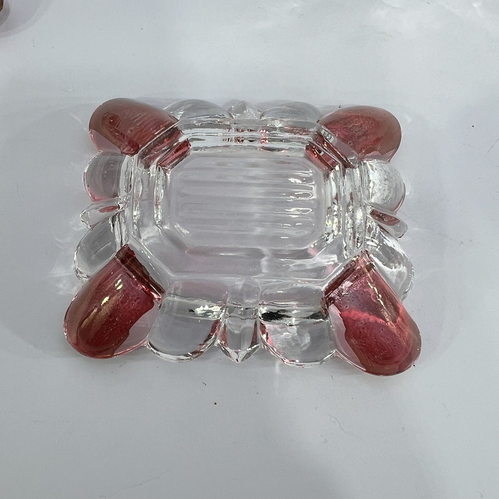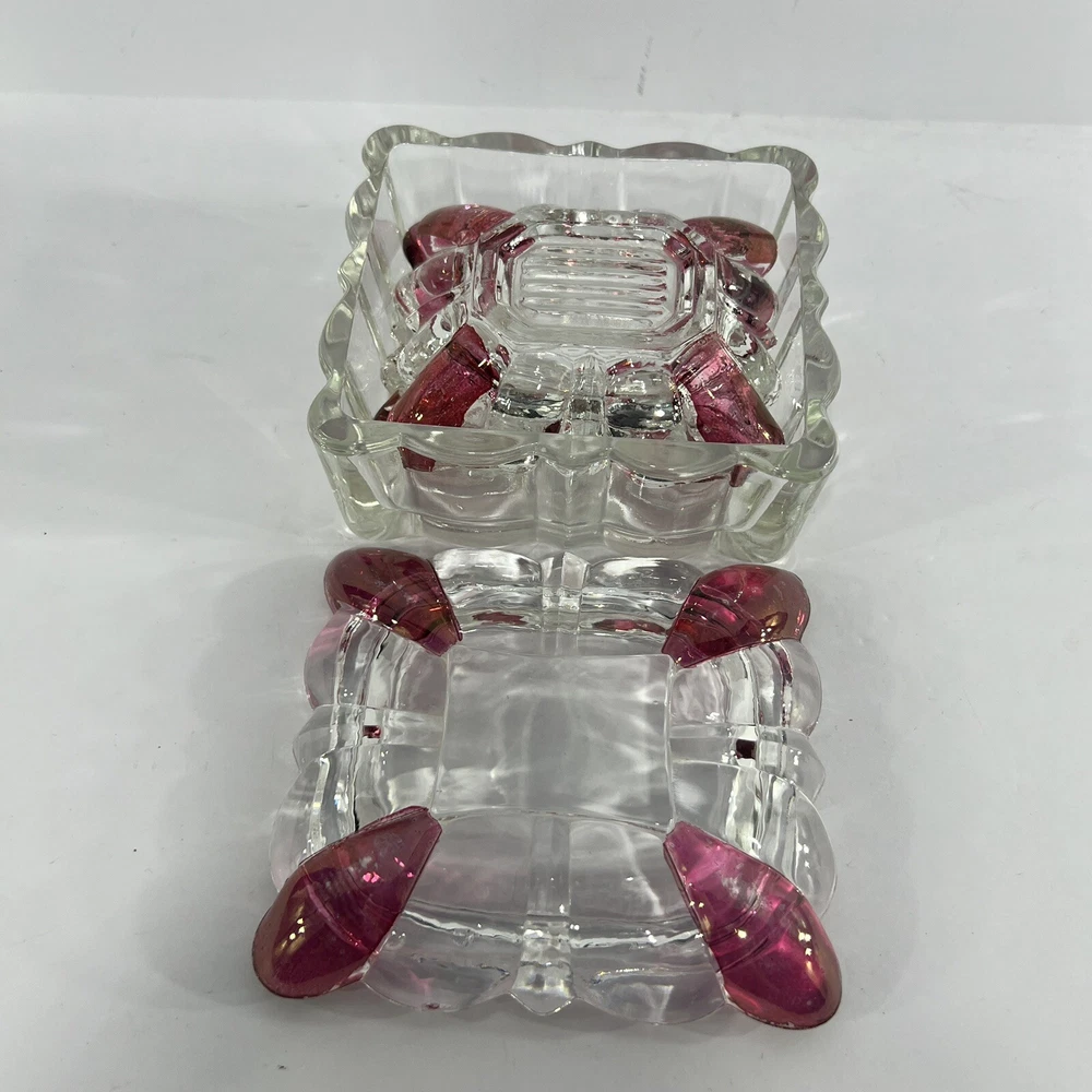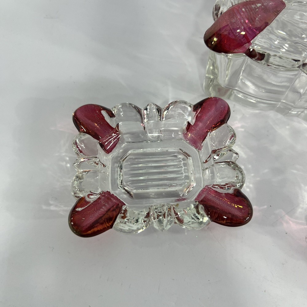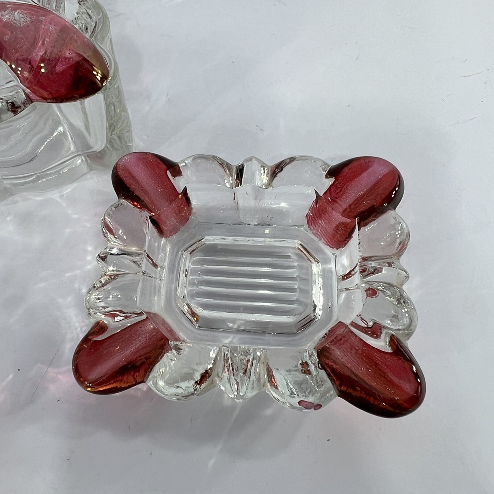 Please see photos for condition of items. Very pretty, in aged vintage condition. This Westmoreland Ruby Red Flashed Glass Cigarette Box is a decorative and functional piece that will add elegance to any room. The box has a rectangular shape and is made of pressed glass, with a removable lid for easy access. It features a beautiful red color and has one compartment for storing cigarettes or other small items. The box is also a perfect trinket dish for storing small accessories like jewelry or coins. The box is made in the United States and is a great addition to any antique or decorative collection. It is a press-molded glass piece with a smooth surface and a brand name of Westmoreland. This item is perfect for those who appreciate the beauty and craftsmanship of vintage glassware.