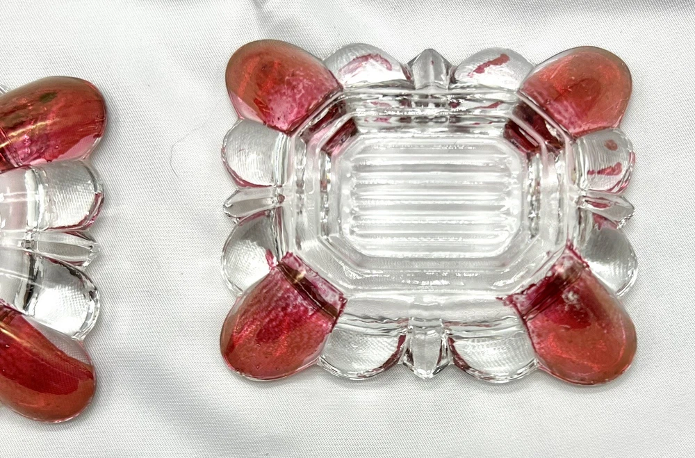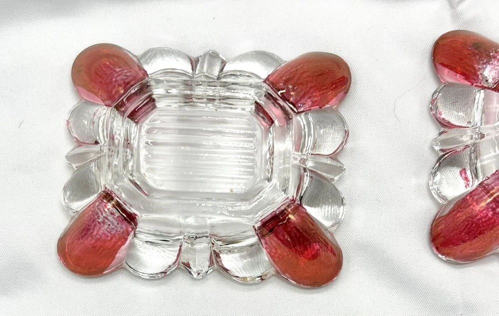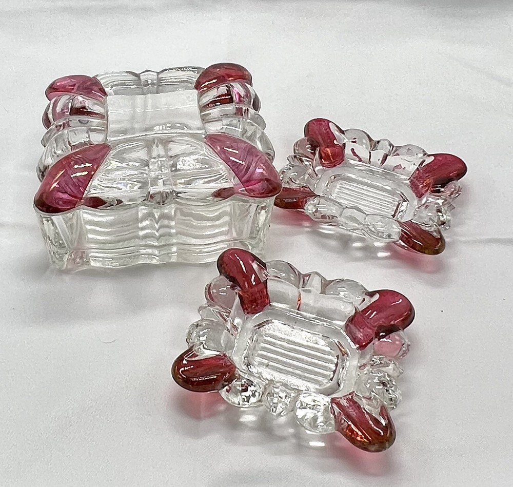 Condition is used but pieces appear to be in good shape. Some color worn away due to age and use. Please review all pictures. Cigarette box with 2 matching ashtrays. Could be used as trinket box and dishes.