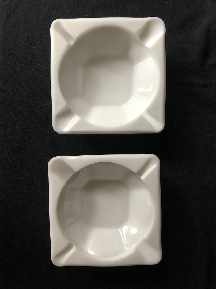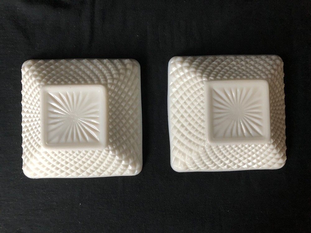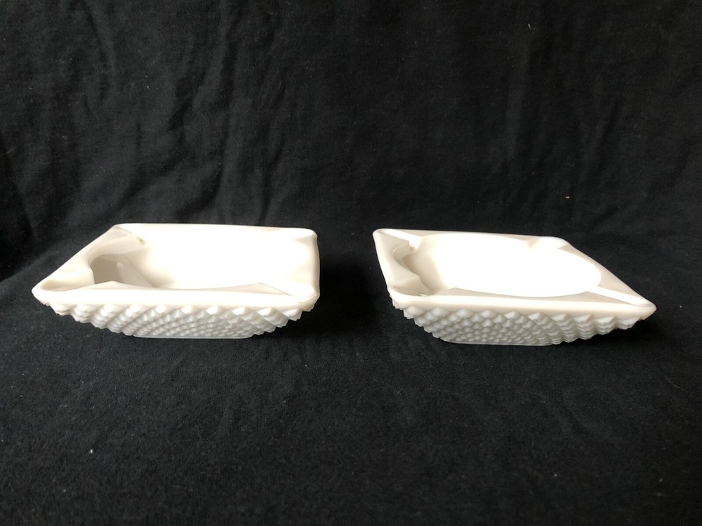 Westmoreland ashtray hobnail square white signed vintage Approximate size: 4.5 in. square Weighs 12 ozs. Signed with "W" as shown Combined Priority shipping on both