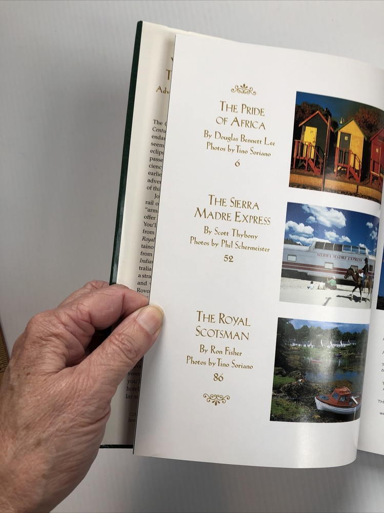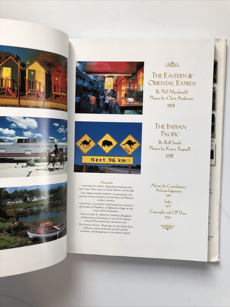 World's Great Train Journeys: National Geographic book HC. 10 1/2 inches by 7 inches. It was published in 2002 from variety of authors and photographers. This is a fun read of travels.