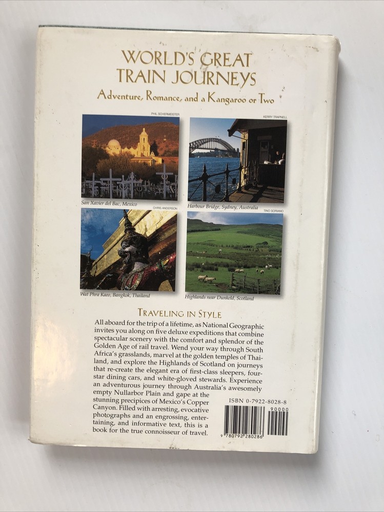 World's Great Train Journeys: National Geographic book HC. 10 1/2 inches by 7 inches. It was published in 2002 from variety of authors and photographers. This is a fun read of travels....