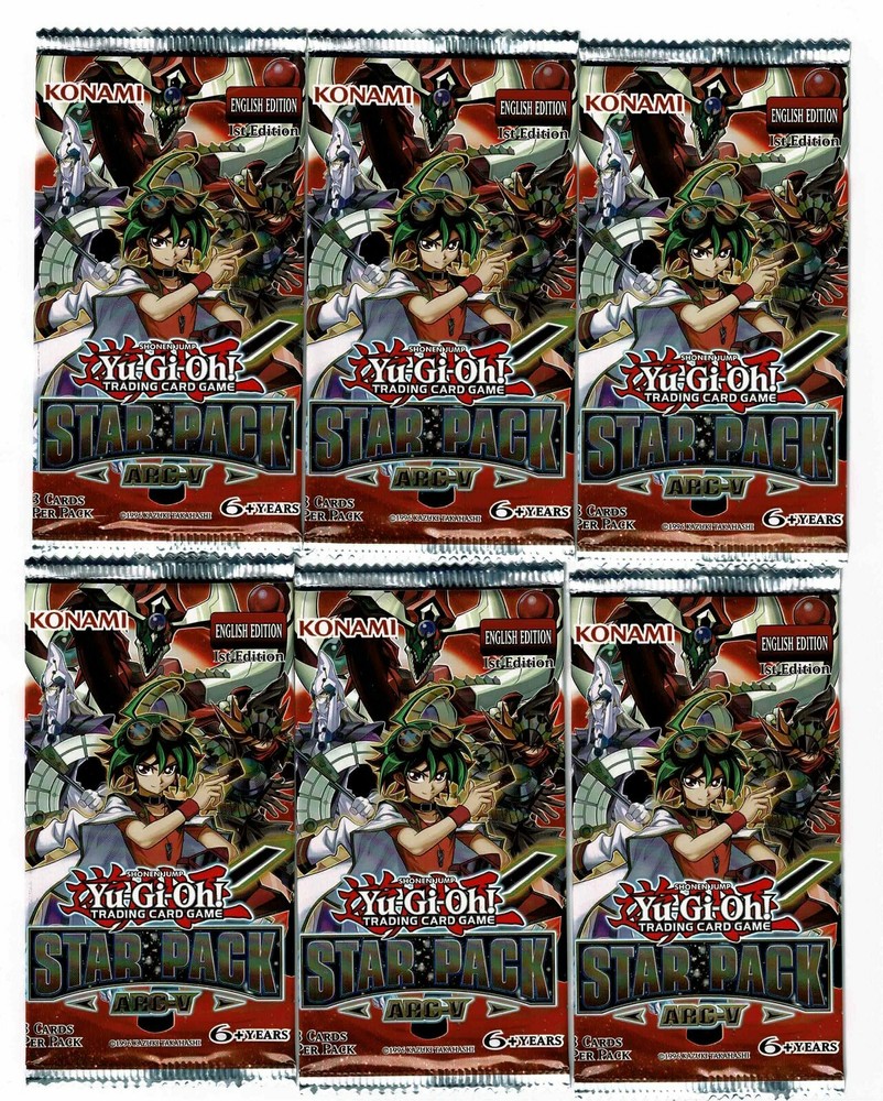 WELCOME TO WALDENCARDS YUGIOH - MAGIC The Gathering SPORTS & SUPPLIES ************************************************************************************** THIS AUCION IS FOR 1 LOT STAR PACK ARC-V 1ST EDITION YU-GI-OH FACTORY SEALED BOOSTER PACKS (6 PACK LOT) 6 PACK LOT OF YUGIOH STAR PACK ARC-V BOOSTER PACKS, EACH PACK CONTAINS 3 GAME CARDS. PLEASE FEEL FREE TO EMAIL ME BEFORE BIDDING WITH ANY QUESTIONS REGARDING THIS ITEM THESE ARE PRODUCED BY KONOMI AND ARE IN ENGLISH ************************************************************************************** Free Domestic Shipping ******************************************************************************************************************* FOR OTHER THAN BUY IT NOW ; PAYMENT PAYPAL For All Credit Cards ********************************************************************************* SHIPPING WE USE USPS, PRIORITY MAIL & FEDEX ****OTHER THAN USA SHIPPING ALL INTERNATIONAL SHIPPING COST WILL BE E-MAILED AFTER AUCTION IS COMPLETE , EBAY MAIL US FOR ALL CUSTOM ORDERS OR ANY NEEDS
