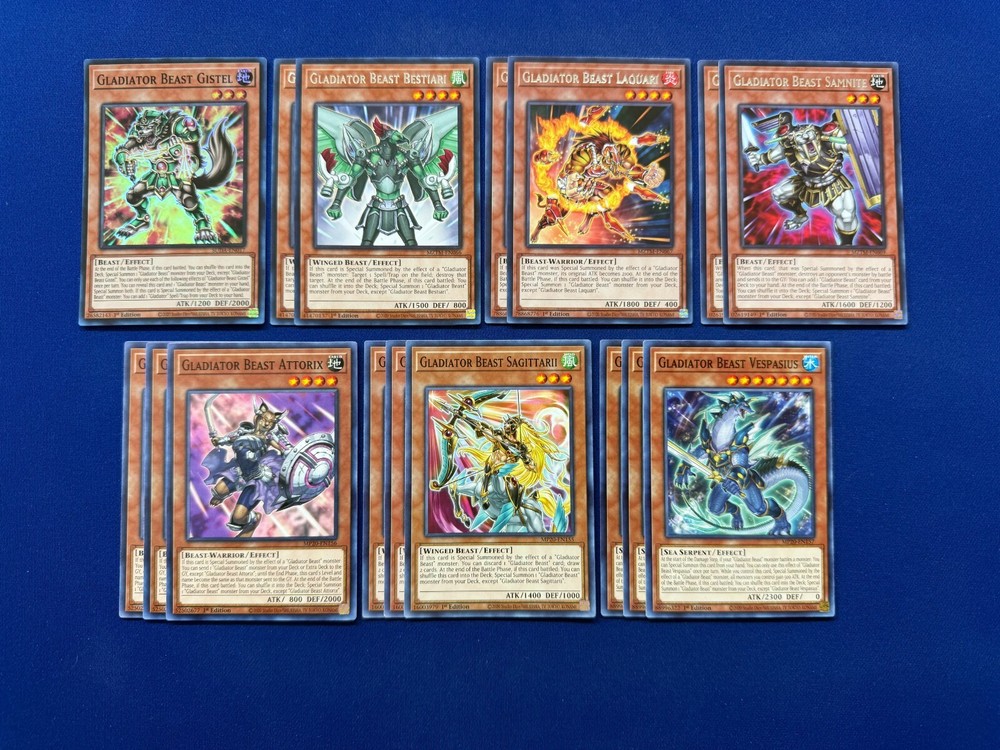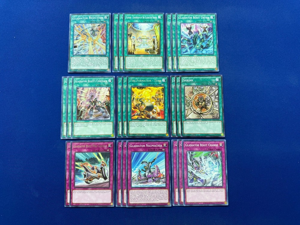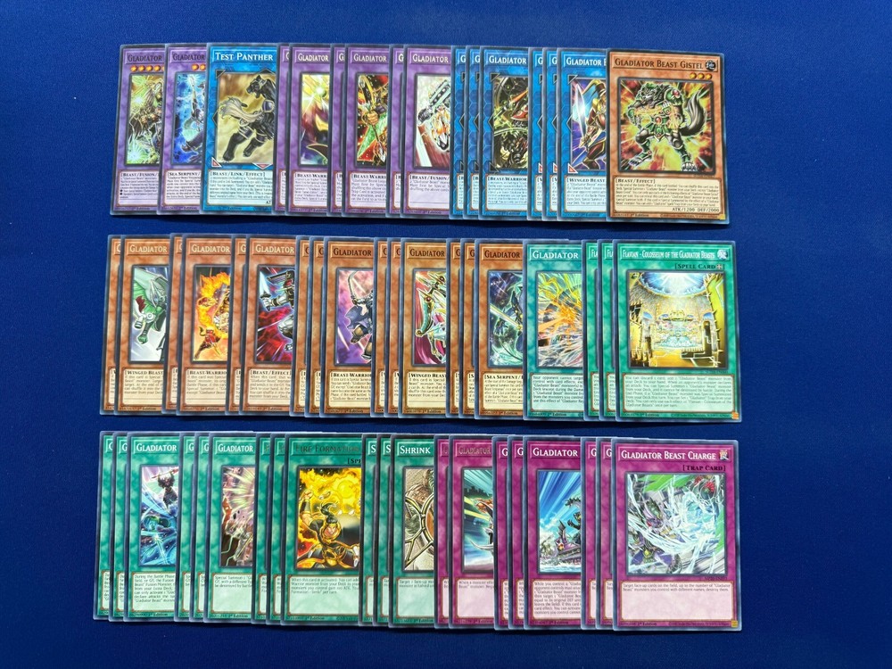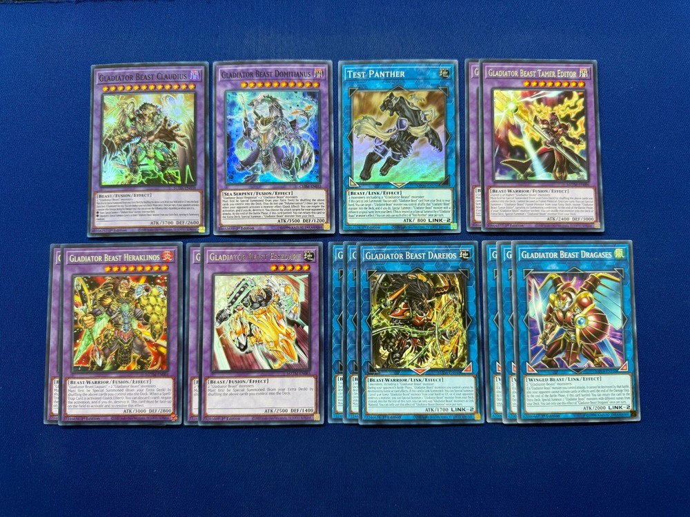 This deck was designed and tested to be ready to play! All cards are in near mint condition (Small chance of lightly played when older cards are involved). By purchasing this item you will receive the following cards: Extra Deck (x15): Gladiator Beast Claudius (x1) - Super Rare Gladiator Beast Domitianus (x1) - Super Rare Test Panther (x1) - Super Rare Gladiator Beast Tamer Editor (x2) - Rare Gladiator Beast Heraklinos (x2) - Rare Gladiator Beast Tamer Editor (x2) - Rare Gladiator Beast Dareios (x3) - Common Gladiator Beast Dragases (x3) - Common Monster (x16): Gladiator Beast Gistel (x1) - Super Rare Gladiator Beast Bestiari (x2) - Rare Gladiator Beast Laquari (x2) - Rare Gladiator Beast Samnite (x2) - Rare Gladiator Beast Vespasius (x3) - Common Gladiator Beast Sagittarii (x3) - Common Gladiator Beast Attorix (x3) - Common Spell (x16): Gladiator Rejection (x1) - Super Rare Flavian - Colosseum of the Gladiator Beasts (x3) - Common Gladiator Beast United (x3) - Common Gladiator Beast's Comeback (x3) - Common Fire Formation - Tenki (x3) - Common Shrink (x3) - Common Trap (x8): Gladiator Beast War Chariot (x2) - Rare Gladiator Beast Charge (x3) - Common Gladiator Naumachia (x3) - Common Shipping and Handling: Both Domestic and International Shipping are offered. All deck items are shipped via First Class Parcel Service (3-5 Days) and comes with tracking. Priority Mail Service (1-3 days) is also offered for Domestic buyers. Price is calculated based on the buyer's location. Payment: Payments are due within 3 days of ordering. Otherwise an Unpaid Item Case will be opened. If you have any questions or concerns, send a message and we'll answer as soon as we can! Please remember to leave feedbeck if you can, especially if you enjoy your purchase! Thank you for your patronage and support!