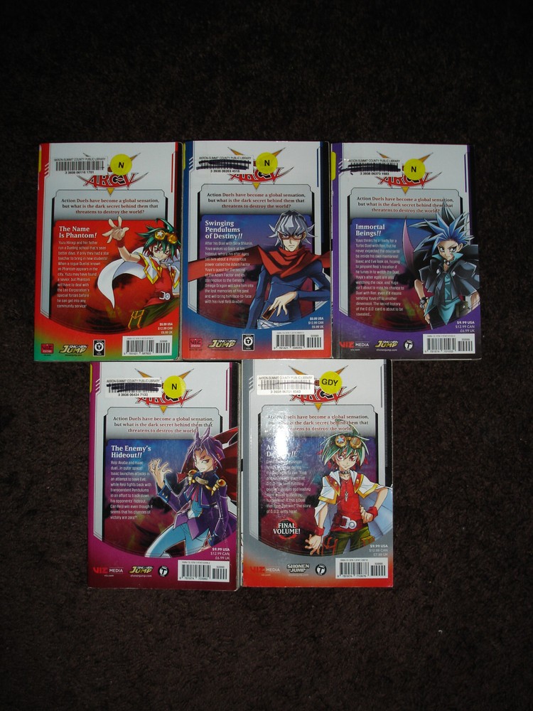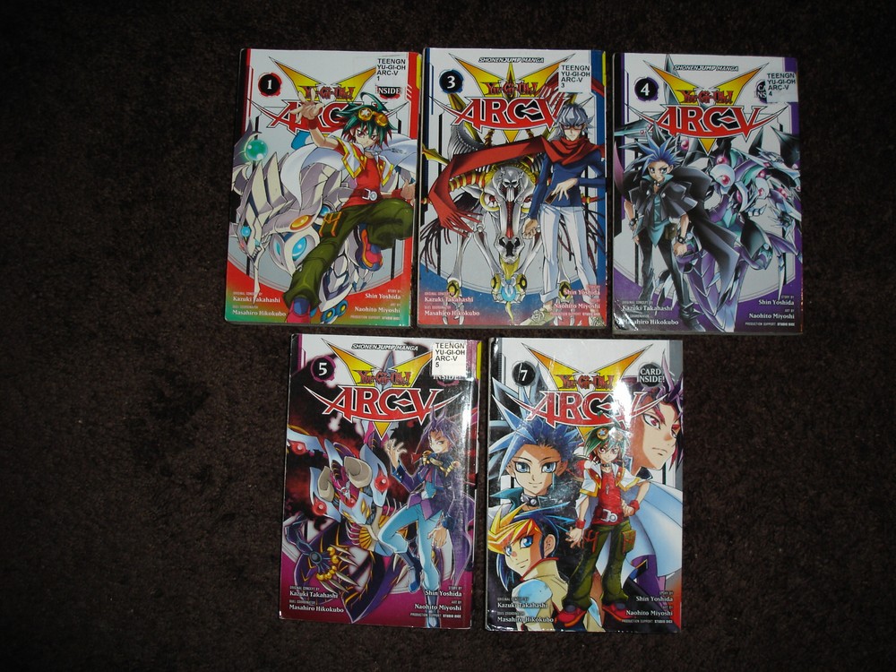 I'm offering a lot of 5 softcover mangas titled "Yu-Gi-Oh, Arc V" by Shin Yoshida (VIZ). You will receive Volumes 1, 3, 4, 5, 7 as pictured. Trading cards not included. All are in English. ****Please Note: All volumes are EX-LIBRARY with expected library stickers and stamps**** Please expect cover wear and small tears/folds on cover and pages - minor soiling due to previous library life. Good used condition with moderate wear and imperfections. Overall good reading collection. Please see all pics above --these are the actual books you will receive. Please ask any questions you may have as my items are offered "As Is/No Returns" due to the fact that they are used and imperfect. If you are unsure of your purchase, please buy from an ebay seller who offers returns. Many do. FREE SHIPPING anywhere within the U.S. --sorry no international shipping. _________________________________________________ IMPORTANT BUYER REQUIREMENTS: NO ZERO FEEDBACK BUYERS PLEASE. Contact me FIRST for permission if you wish to purchase. I have the right to cancel the transaction if this requirement is not met. *** I do not hesitate to call ebay for any/all scams so take your charades elsewhere. Thanks!*** ______________________________________ Thanks for looking! I hope you're having fun on ebay!