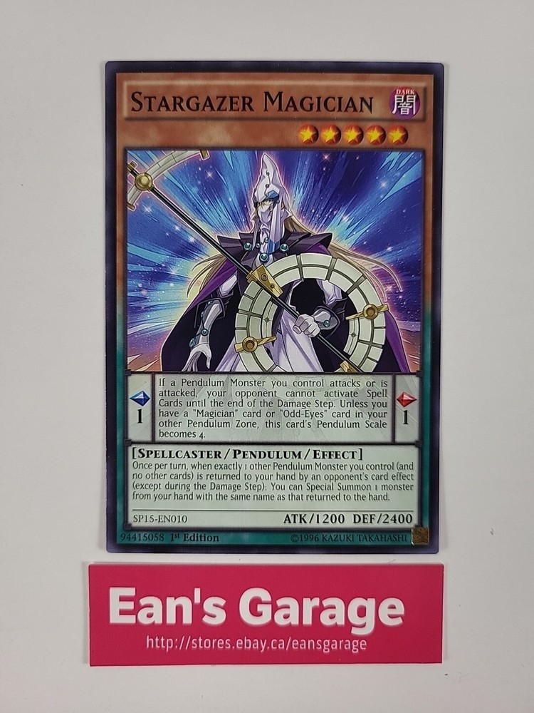 Yu-Gi-Oh! Stargazer Magician 1st Edition Common Star Pack ARC-V SP15-EN010 Condition: Mint Details (+): Bright and glossy colors, firm and flat, no tearing, no stains, no folds NOTES: All our cards are new and never been played All cards include a rigid Toploader card holder and a clear protective sleeve Please see pictures and read the information below SAVE ON SHIPPING! COMBINED SHIPPING SAVINGS APPLY AUTOMATICALLY WHEN YOU ADD MULTIPLE ITEMS TO YOUR SHOPPING CART PLEASE READ OUR WARRANTY, SHIPPING AND RETURNS POLICIES BELOW · Condition and grading: · We provide our best judgement based on general comic grading standards, we are not professional or certified graders. · FA: (Fair) Lots of problems, stains, big chunks missing, loose pages, split spline, etc. · GD: (Good) some wear and tear, small tears or small pieces missing, heavy roll on spline · VG: (Very Good) little wear and tear, little gloss, some creases and small folds, yellowish pages, some minor damage on spline but pages are all attached · FN: (Fine) very little wear, minor creases or folds, some stress marks on spline · VF: (Very Fine) minor wear, firm and flat spline, minor folds or bends · NM: (Near Mint) looks glossy and new, firm and flat, very minor marks · MN: (Mint) almost perfect condition · Gem Mint: perfect condition.... Warranty Contact us if you have any issues with an order as your first step, we will do our best to resolve any problems in a fast and professional way. We have done our best to describe the items we sell as accurate as possible, again, if you have any questions, please ask before shopping Our games and movies are tested so we guarantee they are in good operational condition, regardless, if any issues arise within 48 hours after receiving your items, please contact us. There is no guarantee for any download codes or it's validity and in many cases we ignore if they would've been part of the original package, therefore: No download codes, skins or manuals are included unless noted otherwise. Shipping We combine shipping Within Canada and the U.S: Canadapost Lettermail or Small Packets USA air are our default - transit time can be up to 15 business days (Monday thru Friday) depending on your location. Transit time and Customs clearing are beyond our control. International shipping options may vary depending on your location and might take up to 4 weeks depending on the shipping service you select and it's availability, again, transit time and Customs Clearing are beyond our control. For faster and traceable services please pick Expedited, Express or Priority. Regular letterpost and most Economy services DO NOT include a tracking number We ship within 48 hours (Monday thru Friday), this means that we take your parcel to the postal office, beyond that point is up to the carrier (Canadapost, FedEx or UPS) Please consider these facts when leaving feedback and rating us since we are not the operators. Orders placed on Friday after 3 pm, Saturday or Sunday will be shipped on Monday. Returns 1.- Contact us 2.- Let us know what is the problem immediately after receiving 3.- Only valid reasons for a return are: wrong item or defective item 4.- Do not unpack or use the item(s) 5.- Item(s) must be returned in exact condition as they were shipped by using a traceable postal service Track Page Views With Auctiva's FREE Counter