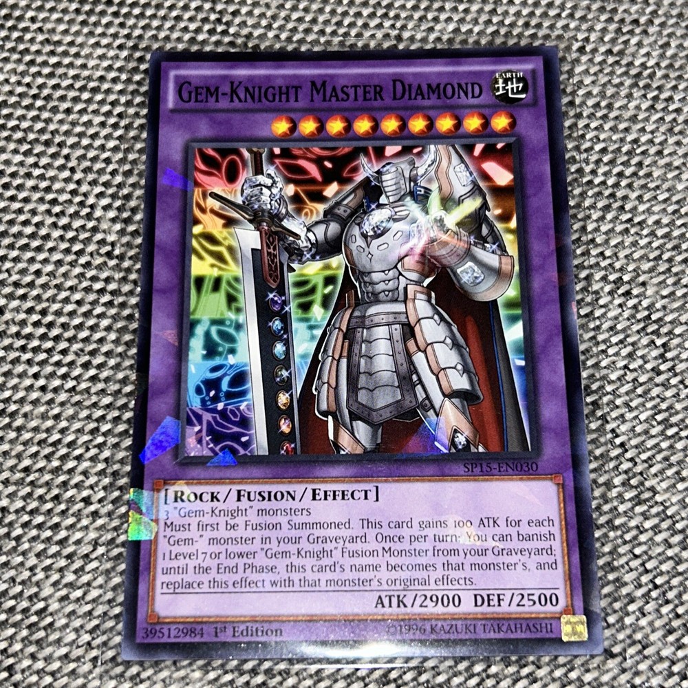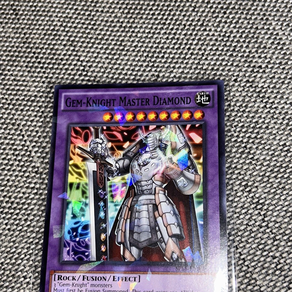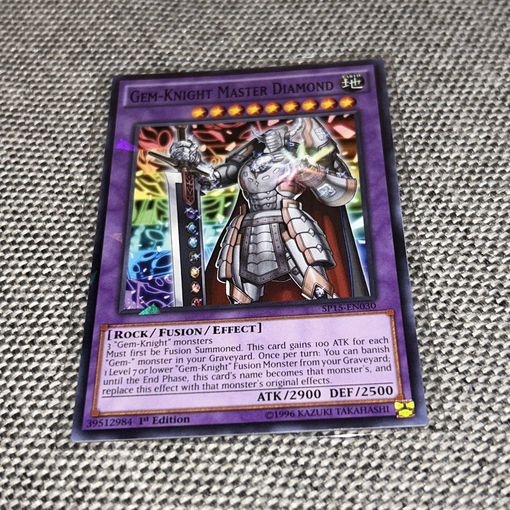 This rare and highly sought-after Yu-Gi-Oh! TCG card features the Gem-Knight Master Diamond, with a stunning shatterfoil finish. It is a 1st edition card from the Star Pack Arc-V set, with the card number SP15-EN030. The card is made of high-quality card stock material, and is a standard size for easy storage and display. With a powerful attack of 2900 and a defense of 2500, this fusion card is perfect for any Yu-Gi-Oh! TCG player. The card is in English language and manufactured by Konami in the United States. It is suitable for ages 4 and up, and is not considered vintage. Add this card to your collection today and become a true gem in the world of Yu-Gi-Oh! TCG.