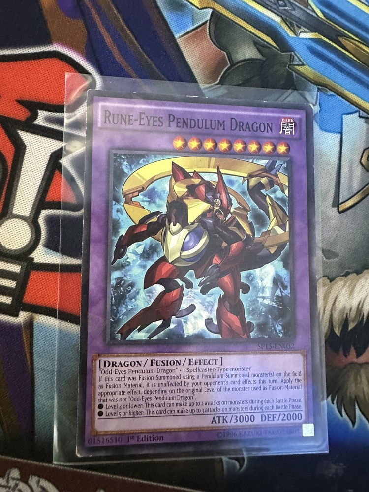 This Yu-Gi-Oh! TCG card features the Rune-Eyes Pendulum Dragon, with 3000 attack and 2000 defense. It is a first edition card from the Star Pack Arc-V set, with card number SP15-EN032. The card is a fusion type, and its rarity is Shatterfoil. The card belongs to the Dragon creature/monster type, and it is a SP speciality card. It is perfect for collectors and players of the Yu-Gi-Oh! TCG game.