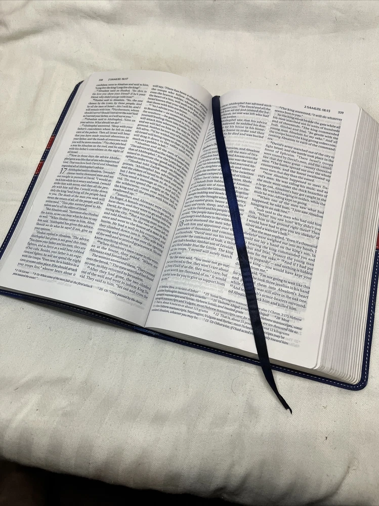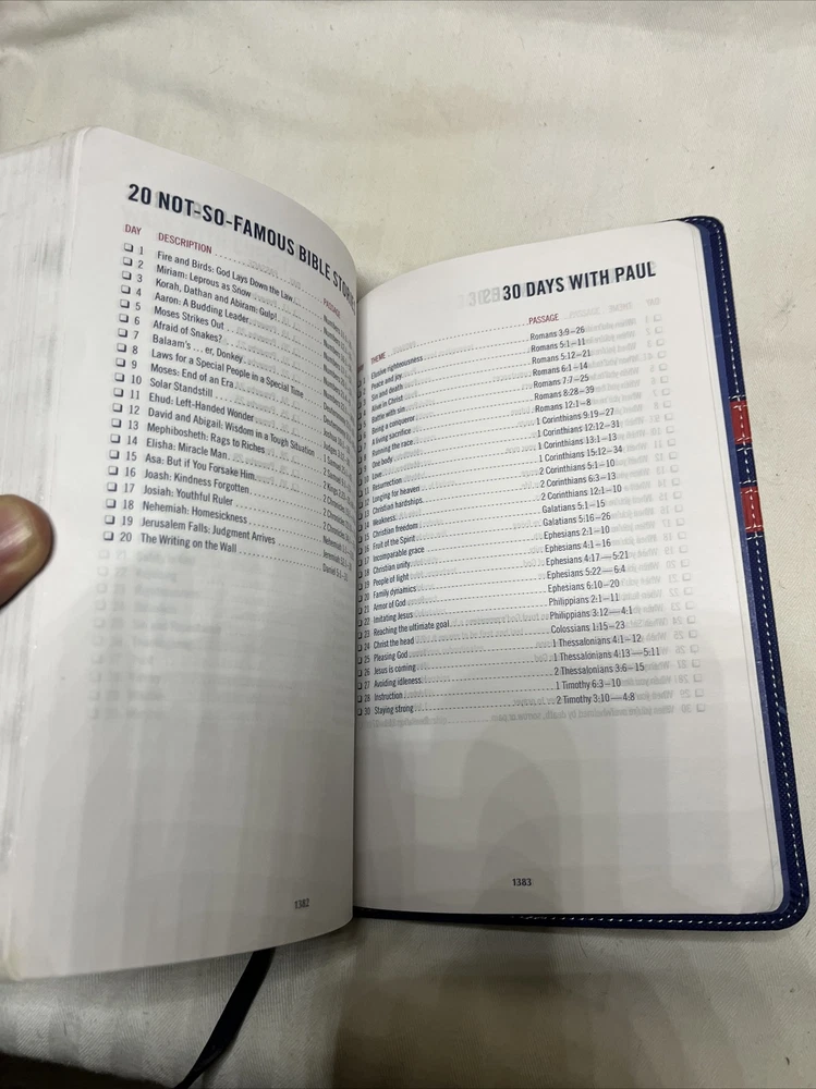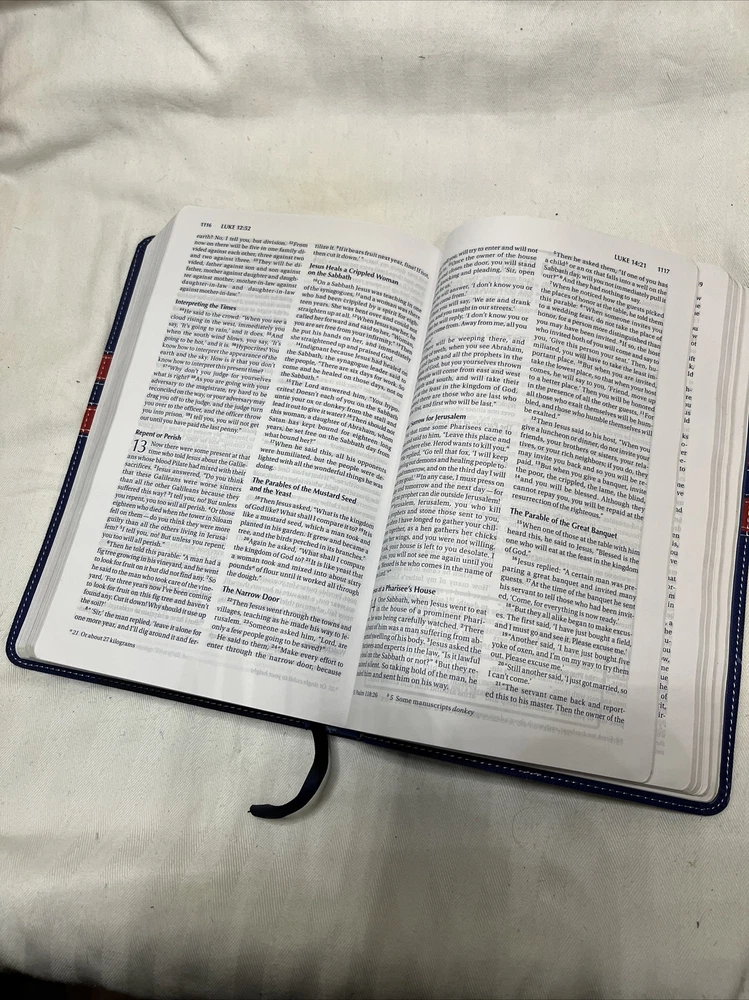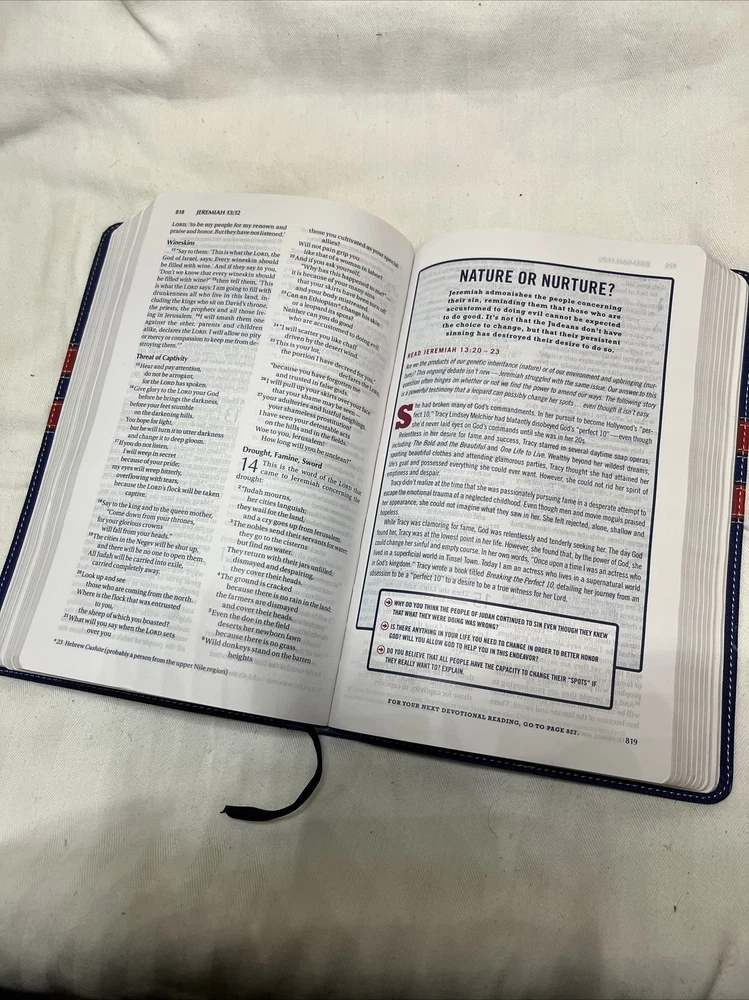 *Exactly* as described, pristine pages, ribbon marker had not been moved/used and there was a small (acceptable) chip out of the front cover. Wonderful book, thanks for all the pics (unlike the used booksellers on eBay where there are NO PICS). Packaged well, arrived safely, timely, affordable. Recommended Book and Seller. Thanks! Have a Blessed Day!