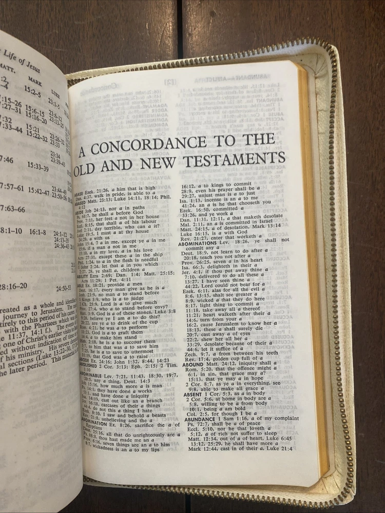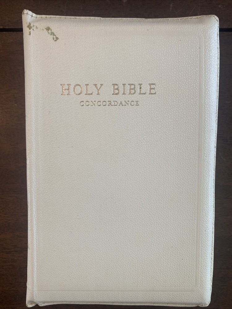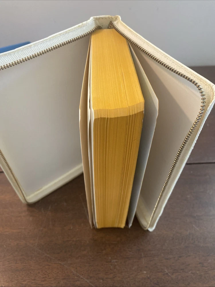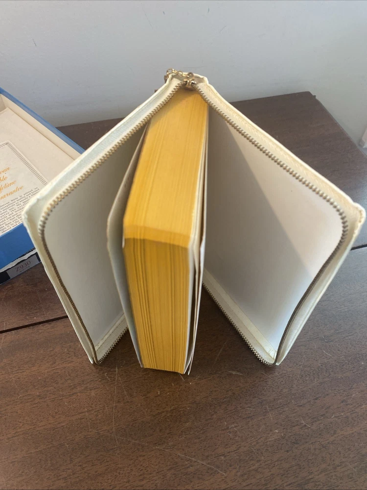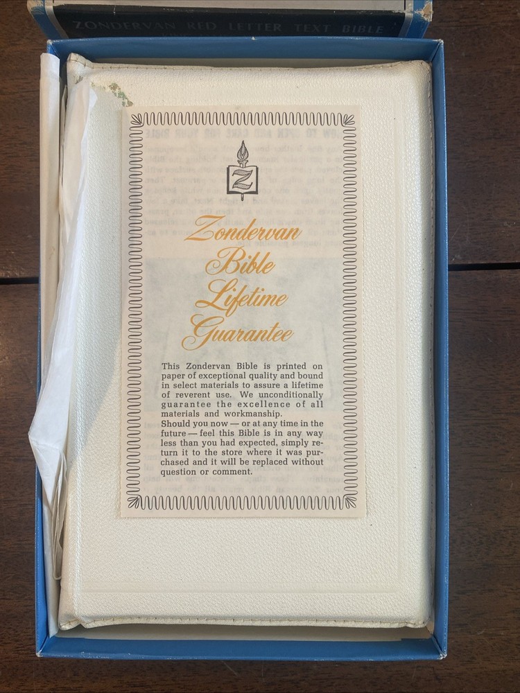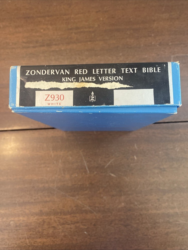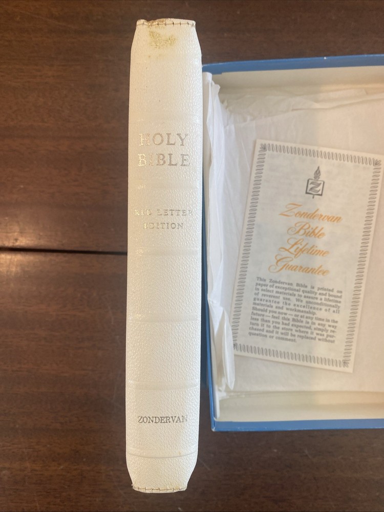 Zondervan Red Letter Text Bible - King James Version - Z-930 with Zipper Closure in Original Box. 128-page Concordance. Words of Christ in red. Self-pronouncing Brevier type. The Presentation page has been removed. Otherwise, the Bible appears to be unused. The interior pages are clean and crisp with no markings. The white leatherlux covers show some storage wear (pictured). This is a hand size Bible, measuring 8" x 5". Please examine the 22 pictures for additional description. FREE Shipping in the USA.