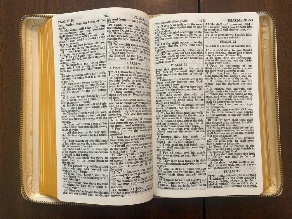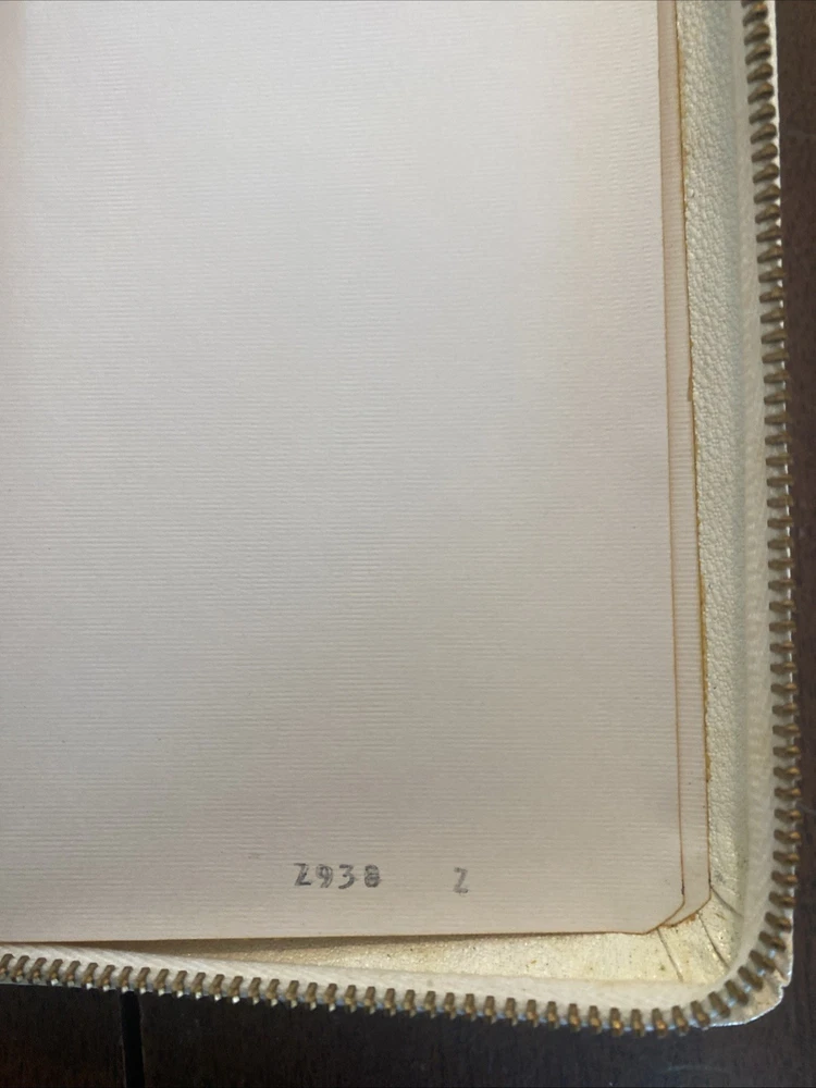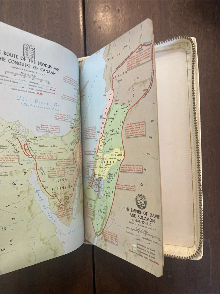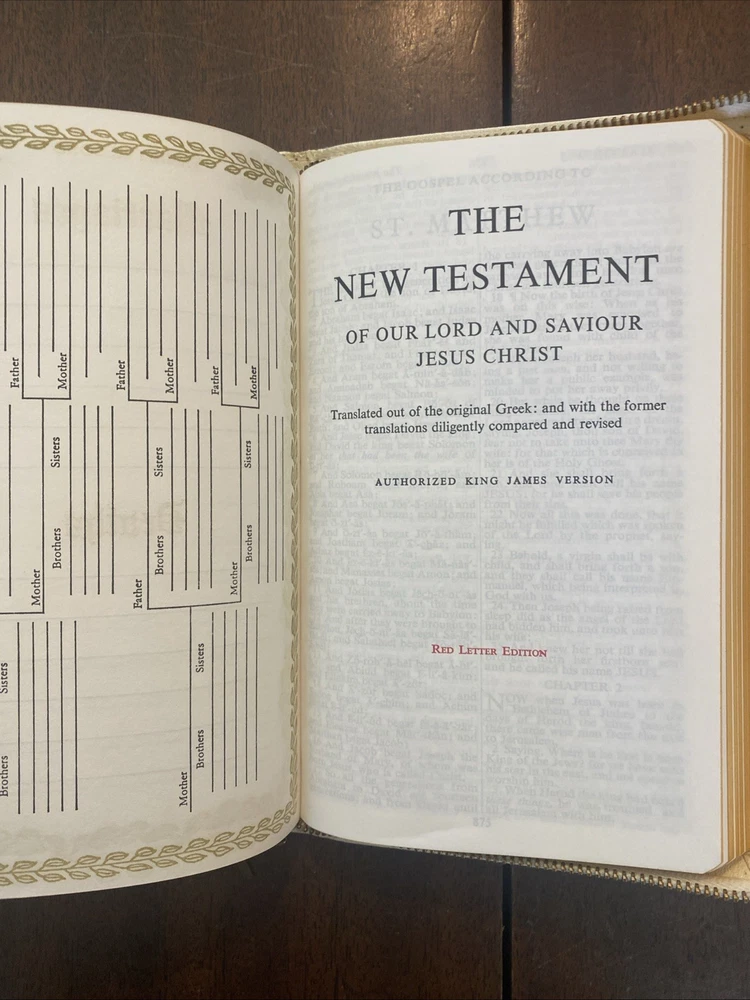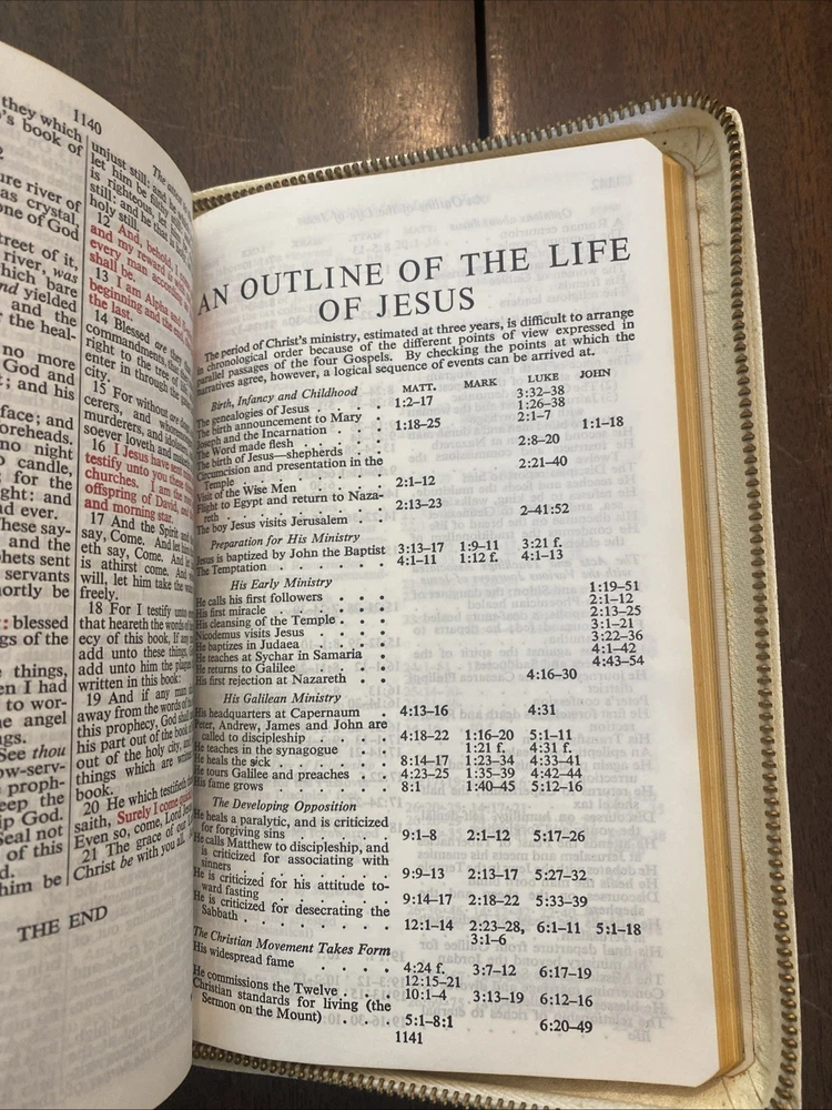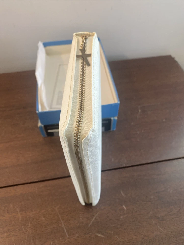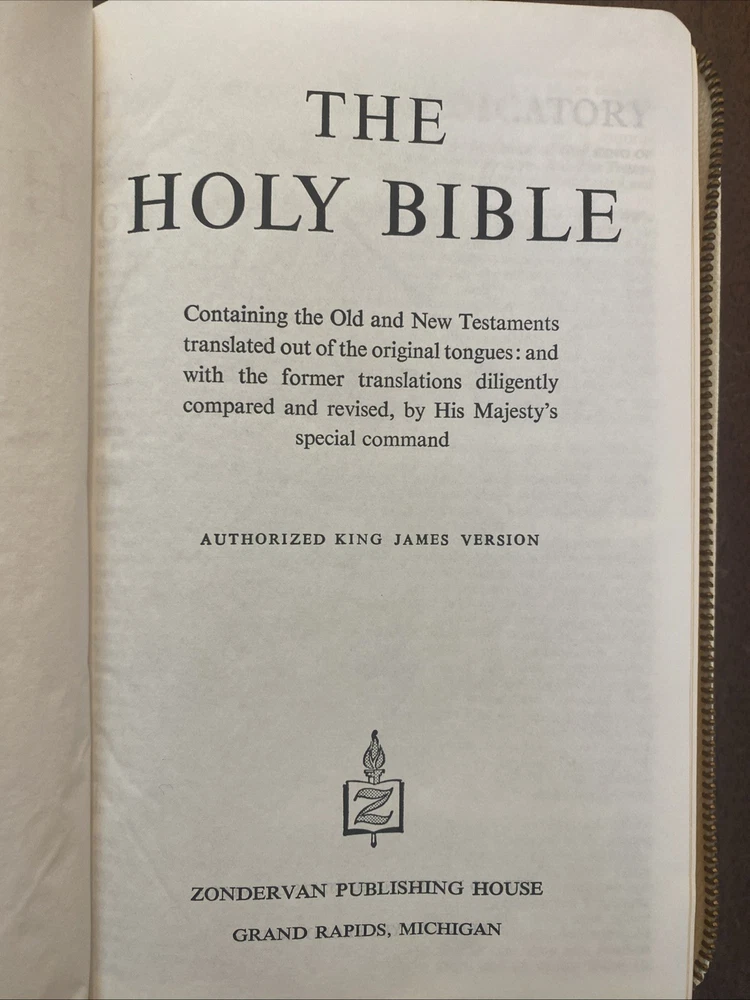 Zondervan Red Letter Text Bible - King James Version - Z-930 with Zipper Closure in Original Box. 128-page Concordance. Words of Christ in red. Self-pronouncing Brevier type. The Presentation page has been removed. Otherwise, the Bible appears to be unused. The interior pages are clean and crisp with no markings. The white leatherlux covers show some storage wear (pictured). This is a hand size Bible, measuring 8" x 5". Please examine the 22 pictures for additional description. FREE Shipping in the USA.