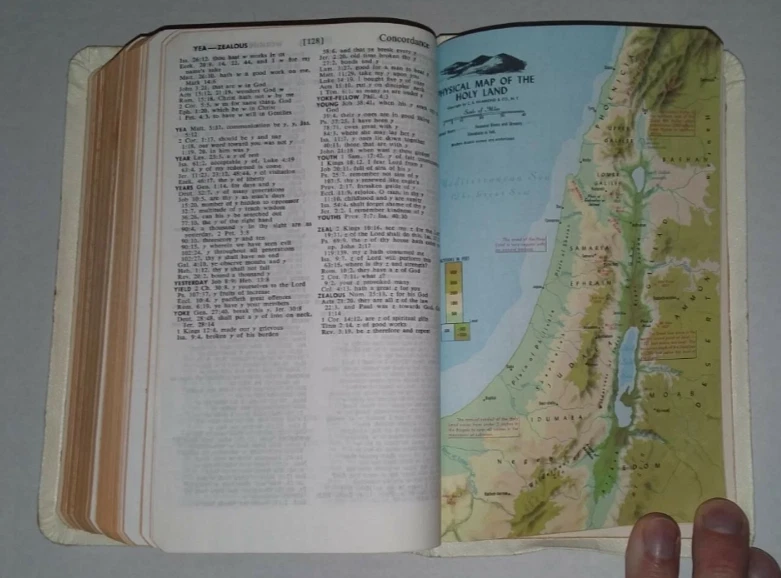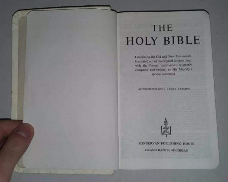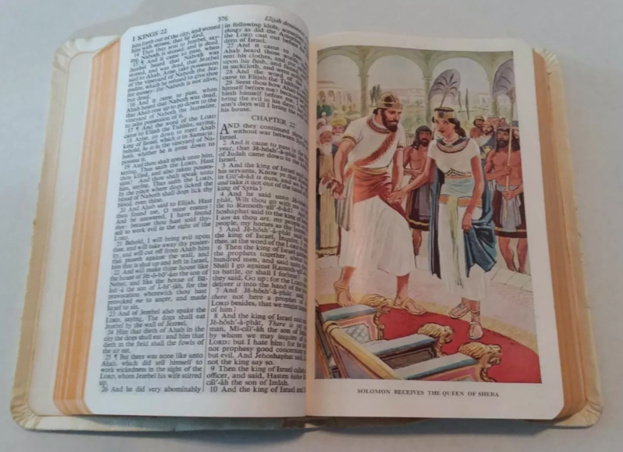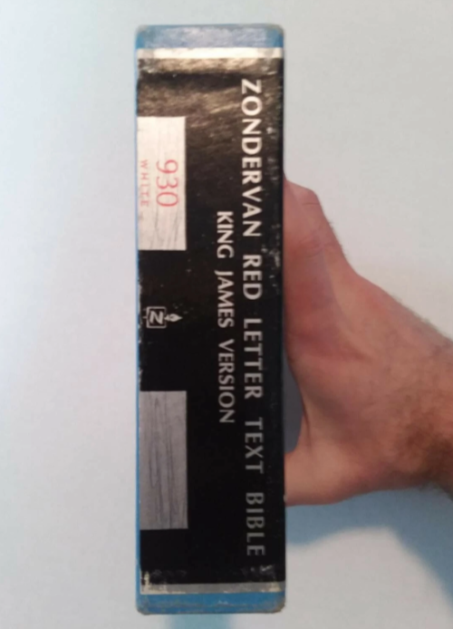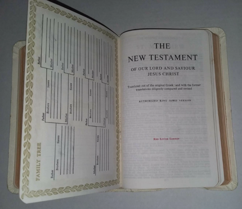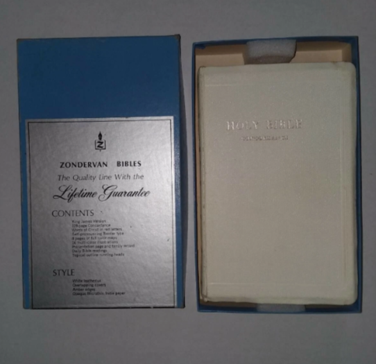 Description from box: "King James Version, 128-page Concordance, Words of Christ in red letters, Self-pronouncing Brevier type, 8 pages of full color maps, 16 multi-color illustrations, Presentation page and family record, Daily Bible readings, Topical outline running heads. Style: White leatherlux, Overlapping covers, Amber edges, Opaque Microthin India paper." Undated. Box has shelf wear with names inside in pencil and pen. Bible cover has moderate wear with creasing to overlaps. Sticker on first endpaper. Presentation page filled out in pen, with some tearing in gutter (binding unaffected). Creasing to some corners. Family records have some entries in pencil. Sparse pen markings to some pages. We package with great care and ship quickly in cardboard. Discount when you buy multiple items in one order. Chris' Li'l Bookstore: serving satisfied customers since 2006. We sell books, music, records, CDs, DVDs, and audiobooks. All USA orders shipped Media Mail only, unless another option is selected and paid for.