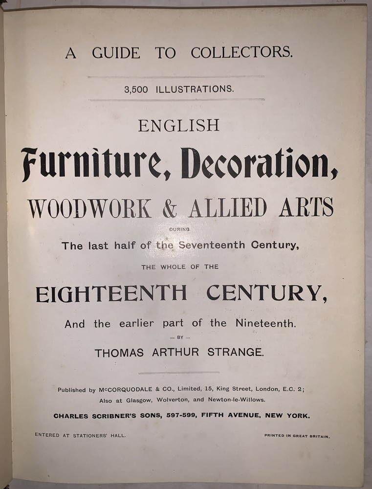 A Guide to Collectors 3,500 Illustrations. English Furniture, Decoration, Woodwork & Allied Arts During the last half of the Seventeenth Century, the whole of the Eighteenth Century, and the earlier part of the Nineteenth. by Thomas Arthur Strange London: McCorquodale & Co. ND, circa 1900 Quarto, 368 pages, publisher's gilt lettered black leather over gilt lettered red cloth covered boards. Profusely illustrated throughout in black and white. Some slight rubbing and wear, else in very good condition. If you have any questions feel free to ask and don't forget to check out my other listings.