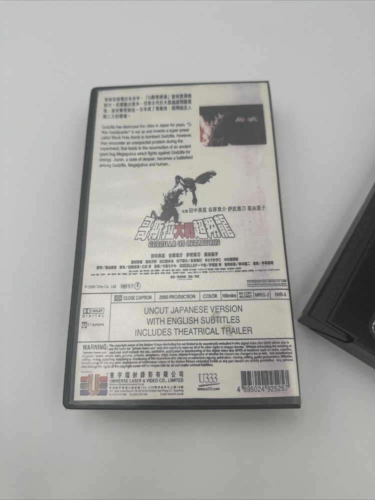 This is an uncut Japanese version of the Godzilla Vs Megaguirus movie, with English subtitles and widescreen format. Fans of the classic Kaiju battles will love this action-packed film, which features the iconic Godzilla taking on the powerful Megaguirus in an epic battle of survival. The VHS format provides a vintage touch to this collectible item, making it a must-have for any movie enthusiast. The language and subtitle language are in Japanese and English respectively, and the features include widescreen format. This is a great addition to any movie or TV title collection, and is perfect for those who enjoy DVDs and Blu-ray discs.