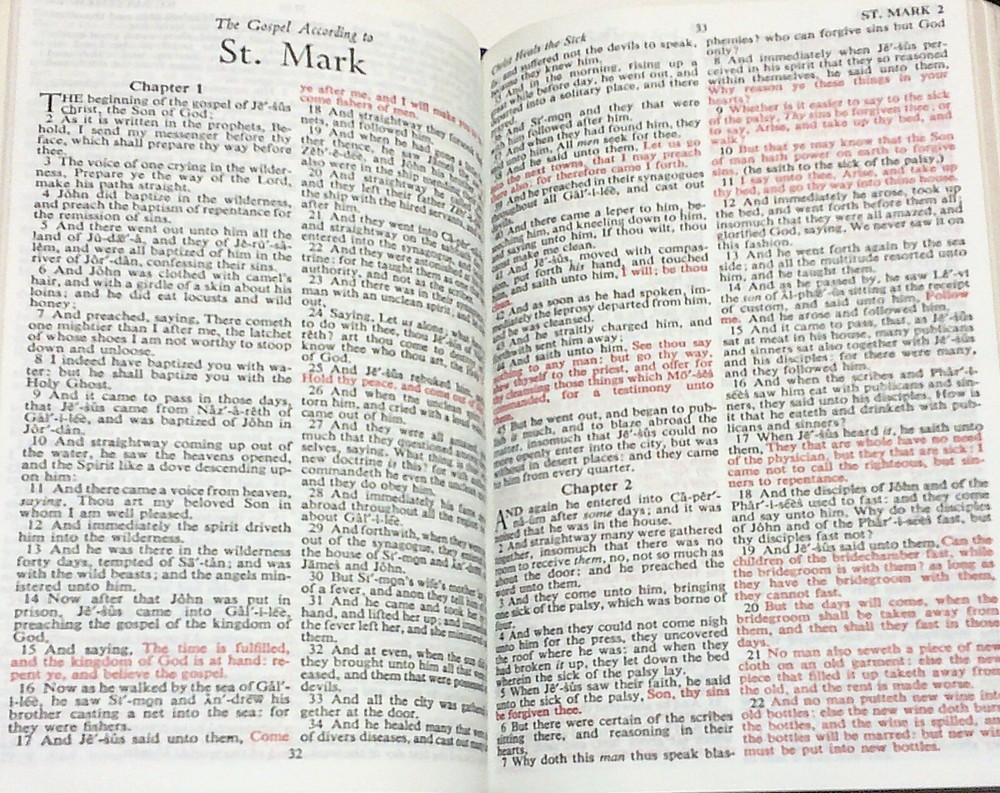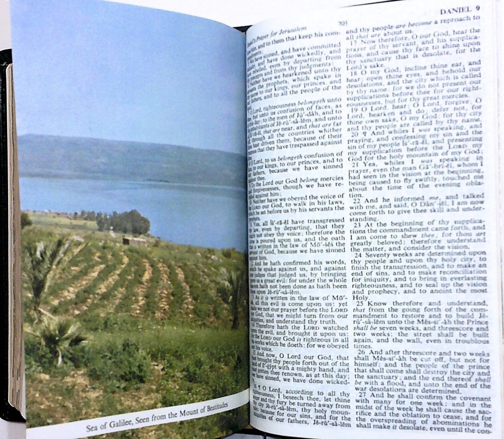 Other than the dedication being filled out, the book is in excellent unmarked condition. Genuine leather cover. 8" x 5.5" x 1.25". Includes original box (has a few scuffs. King James version, with a book summary section, 16 pages of color illustrations, words of Jesus in red, INDO-TEXT India paper, a concordance, 52 pages of Bible Study helps (geography, archaeology,etc) and Bible land color maps. Self-Pronouncing. Semi-overlapping covers. Gold edges. PLEASE BE ADVISED you will also be charged your State's sales tax.